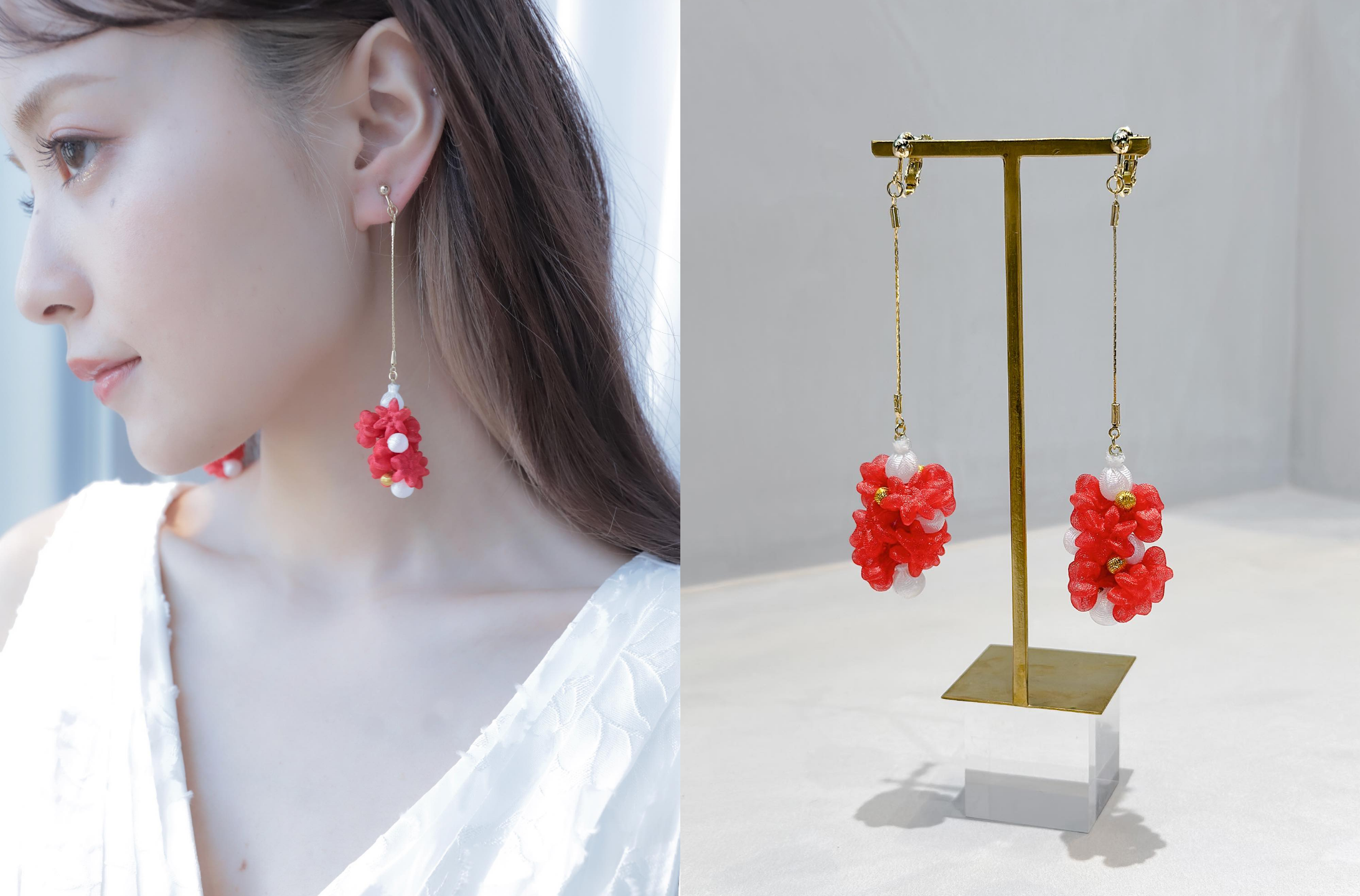 小さなパーツを重ねて、紅葉をイメージして作られたイヤーアクセサリー。鮮やかな色がパッと目を惹き、ドレスにも、和装にもおすすめです