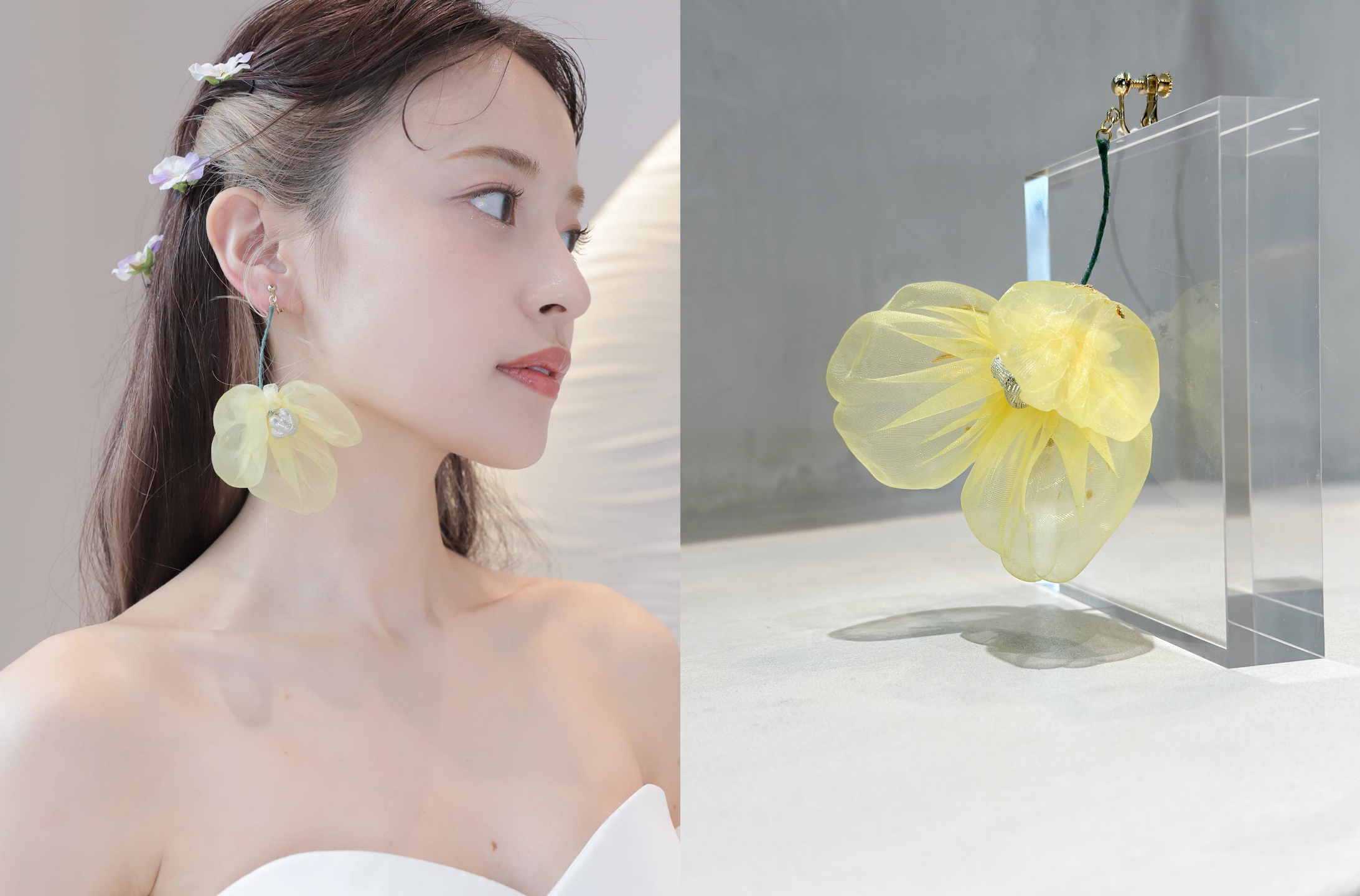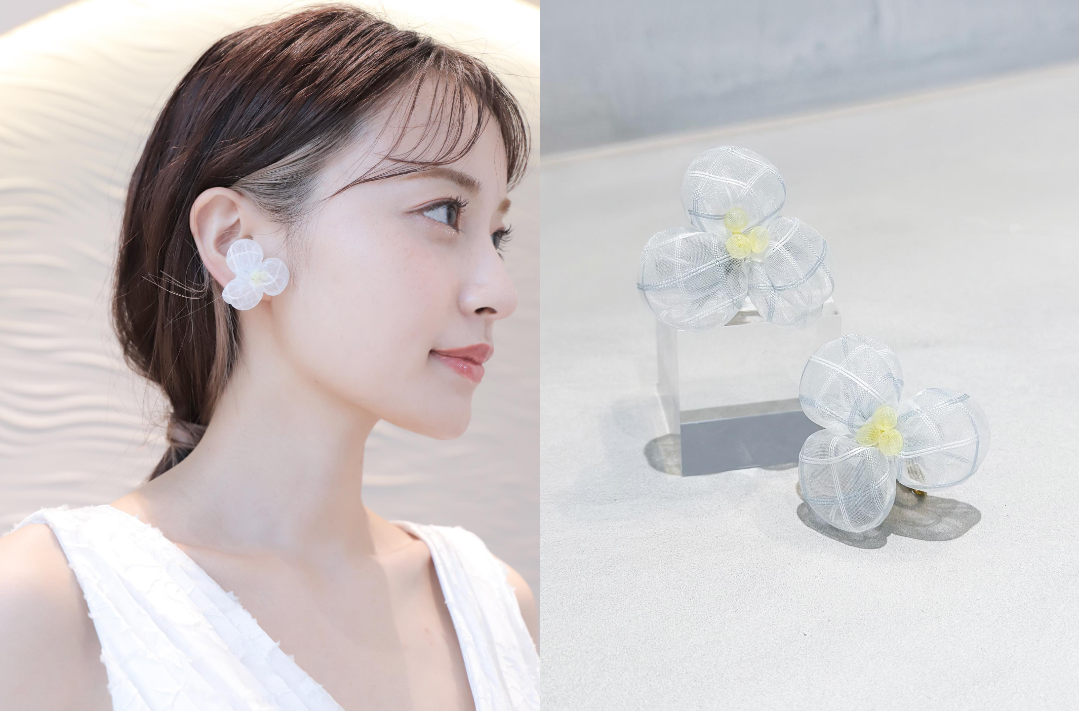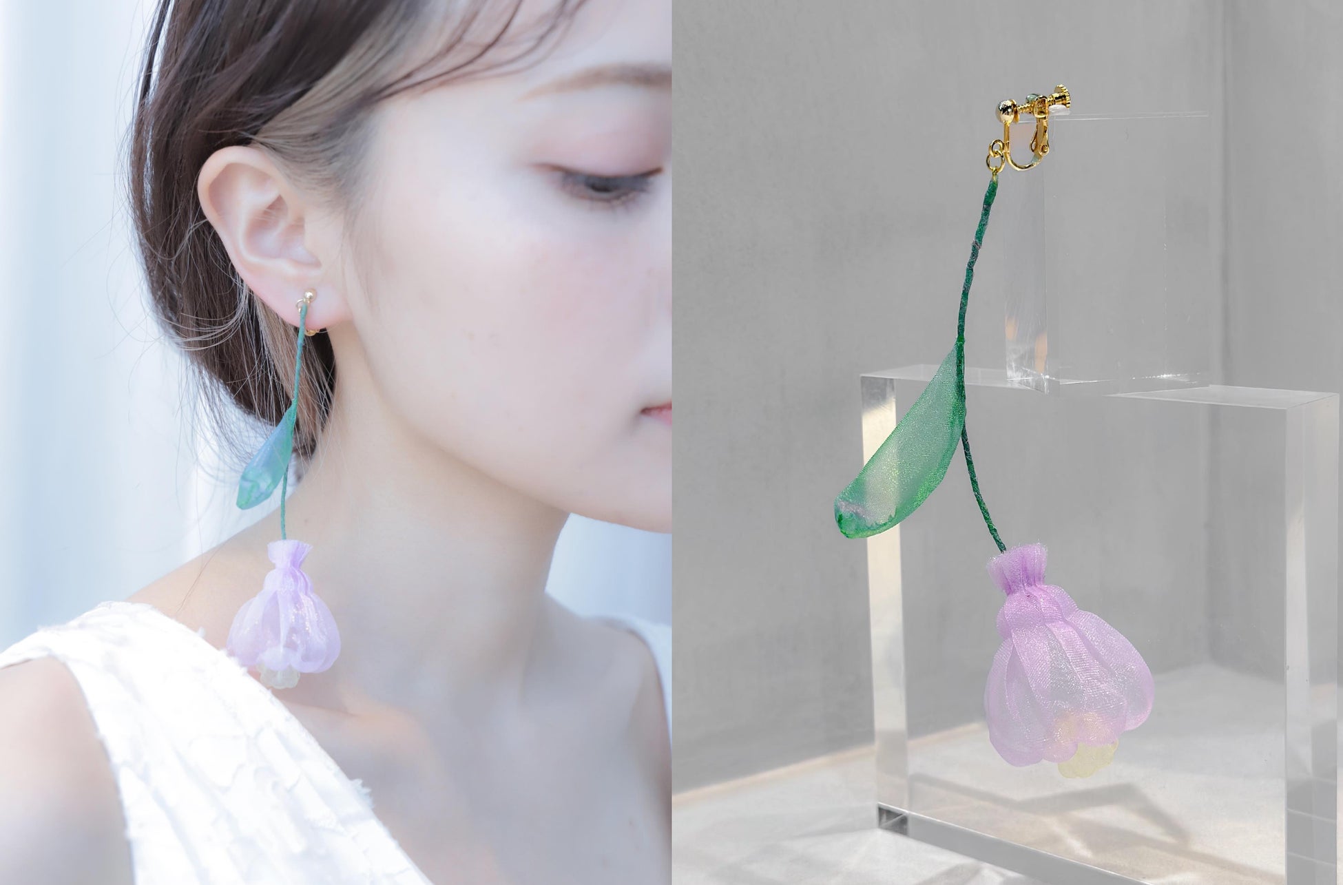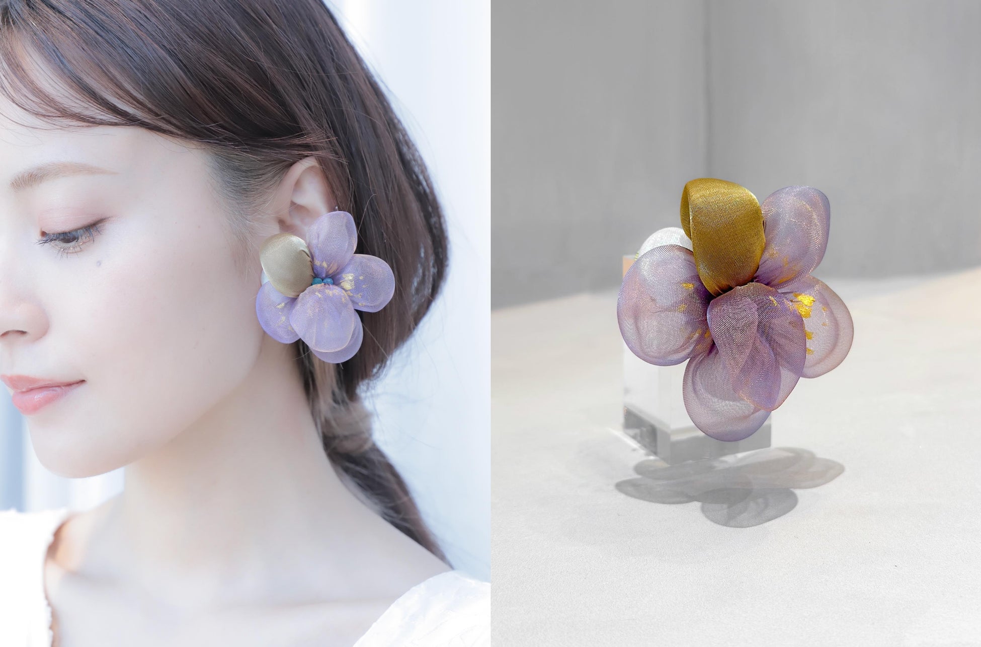 オーガンジーを加工した軽やかな着け心地のイヤアクセサリー。虹色の輝きと優しい雰囲気が魅力です。