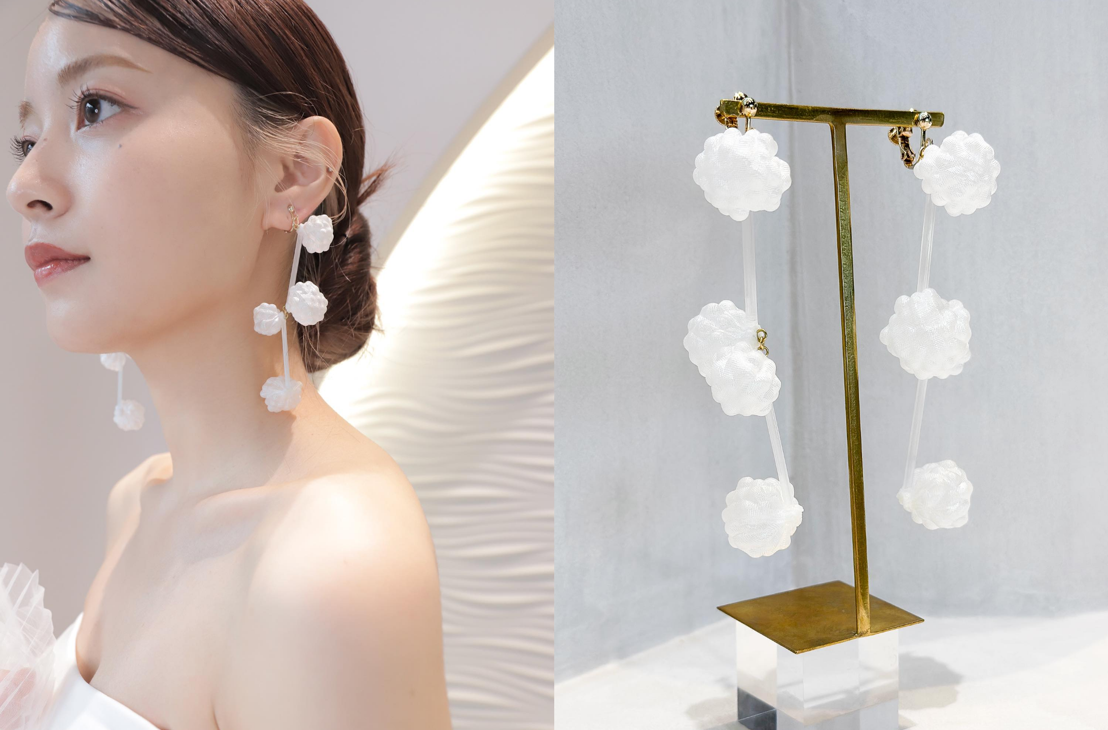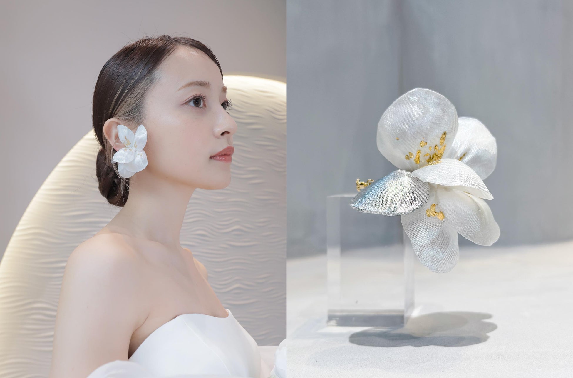 白玉椿、純白のイヤーアクセサリー。アップスタイル・ダウンスタイルどちらにも合うデザインで、女性の華やかさと優雅さをを演出します。