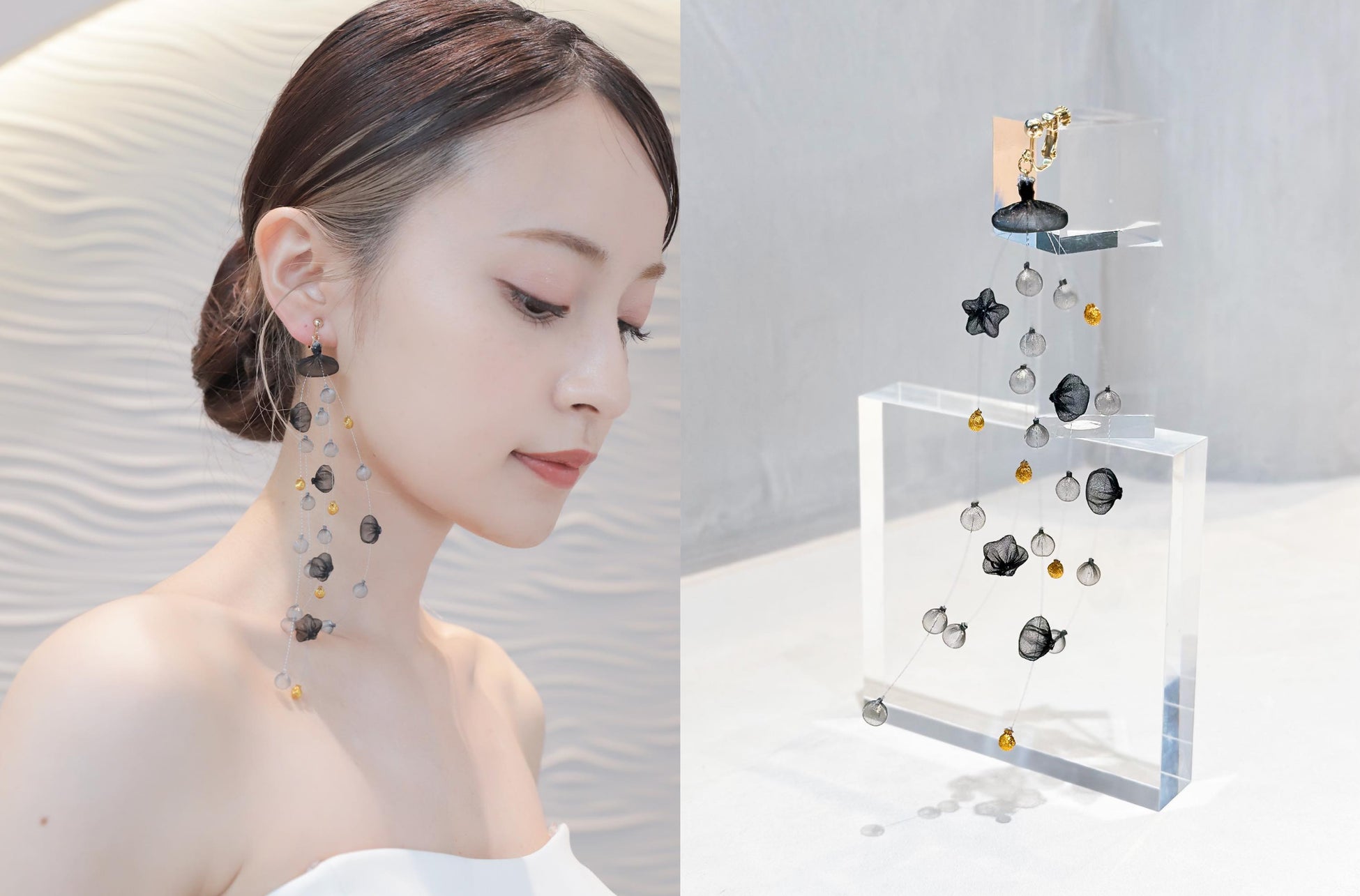 雨夜の星を両耳に飾っていただきたい、そんな想いで作られたモビールのようなアクセサリー。優雅でありつつ、遊び心もあるデザインです。