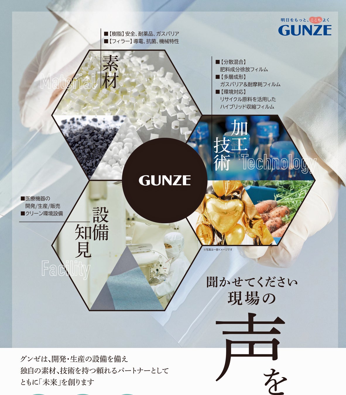 グンゼ株式会社 研究開発部は、「明日をもっと、ここちよく」をキーワードに、皆さまによりそった研究開発を行っています。 お客さま一人一人のここちよさに向けて、(1)機能性フィルムを活用したメディカル製品、(2)繊維技術を活用した健康衣療、の2つのテーマで、この出展を通じて新たなソリューションを生み出す共創パートナーを募集します。
