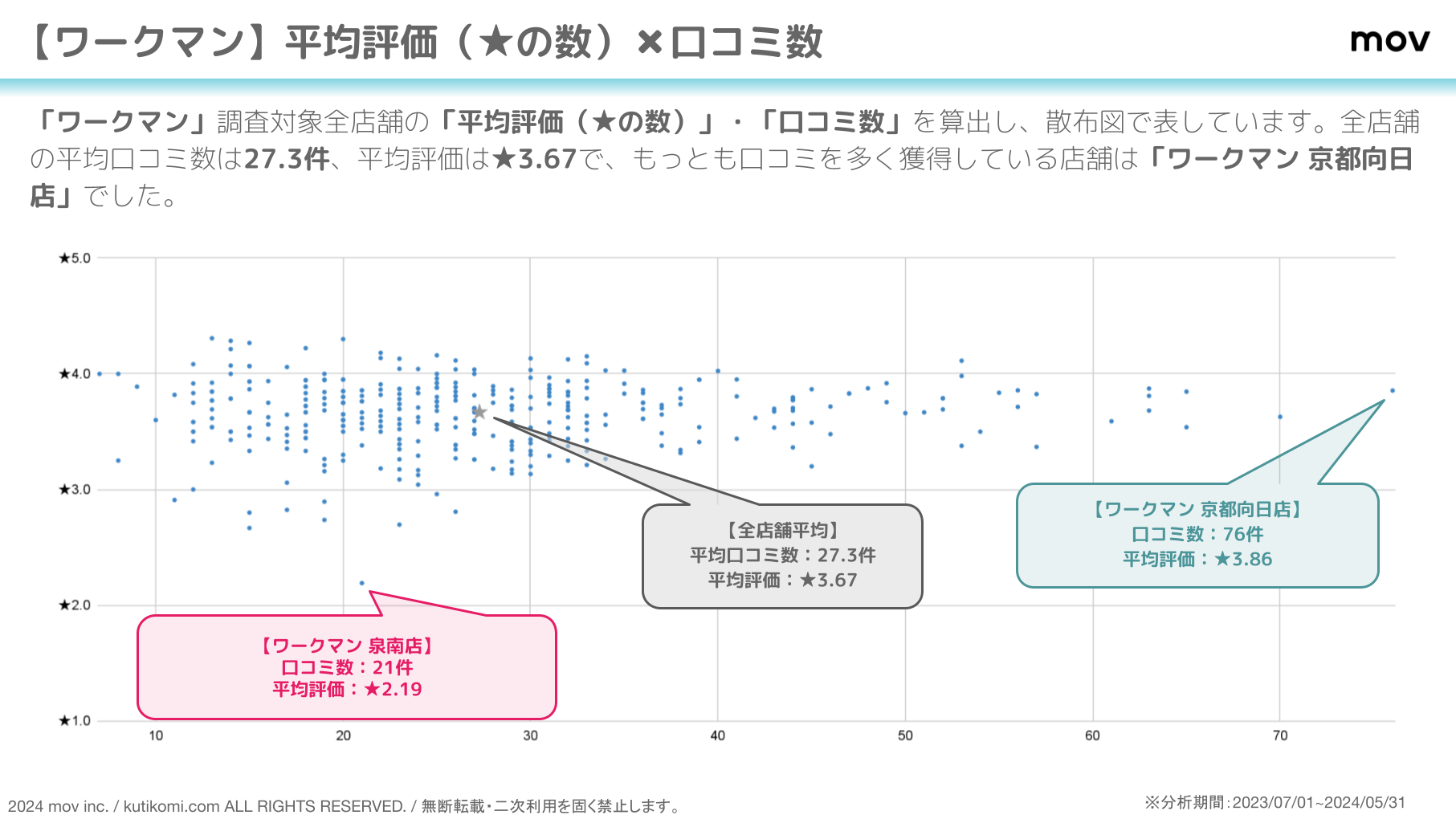 「ワークマン」調査対象全店舗の「平均評価(★の数)」・「口コミ数」を算出し、散布図で表しています。全店舗の平均口コミ数は27.3件、平均評価は★3.67で、もっとも口コミを多く獲得している店舗は「ワークマン 京都向日店」でした。