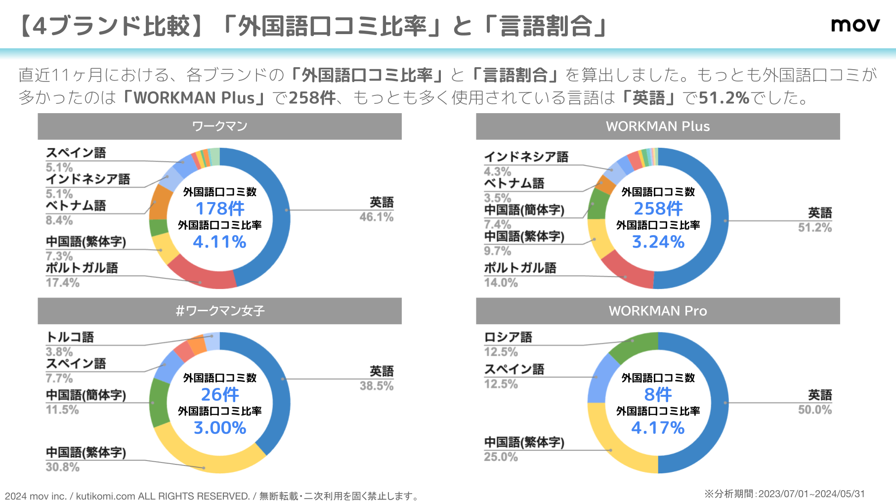 直近11ヶ月における、各ブランドの「外国語口コミ比率」と「言語割合」を算出しました。もっとも外国語口コミが多かったのは「WORKMAN Plus」で258件、もっとも多く使用されている言語は「英語」で51.2%でした。