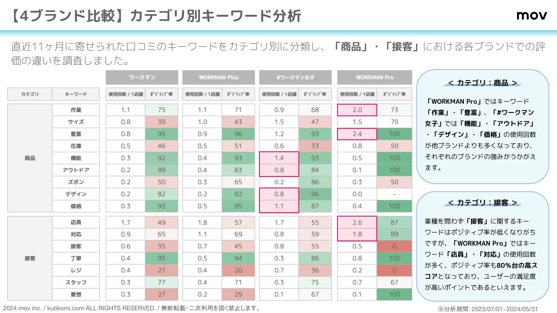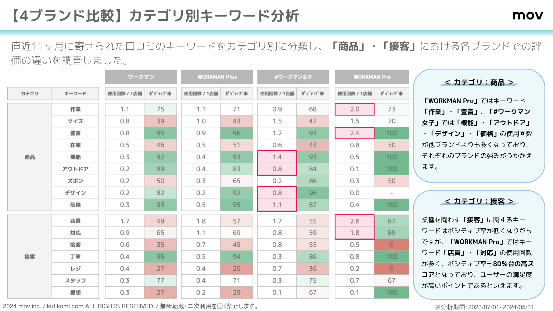 業種を問わず「接客」に関するキーワードはポジティブ率が低くなりがちですが、「WORKMAN Pro」ではキーワード「店員」・「対応」の使用回数が多く、ポジティブ率も80%台の高スコアとなっており、ユーザーの満足度が高いポイントであるといえます。
