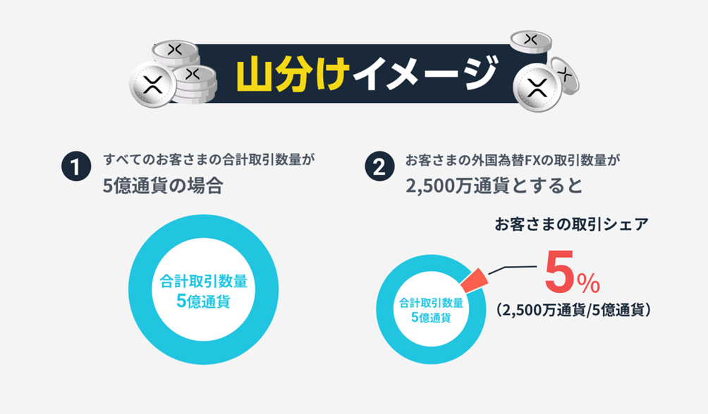 キャンペーン期間中に「外国為替FX」の取引を行ったすべてのお客さまを対象に、合計取引数量に応じて、暗号資産のリップル(XRP)を100万円分、山分けいたします。