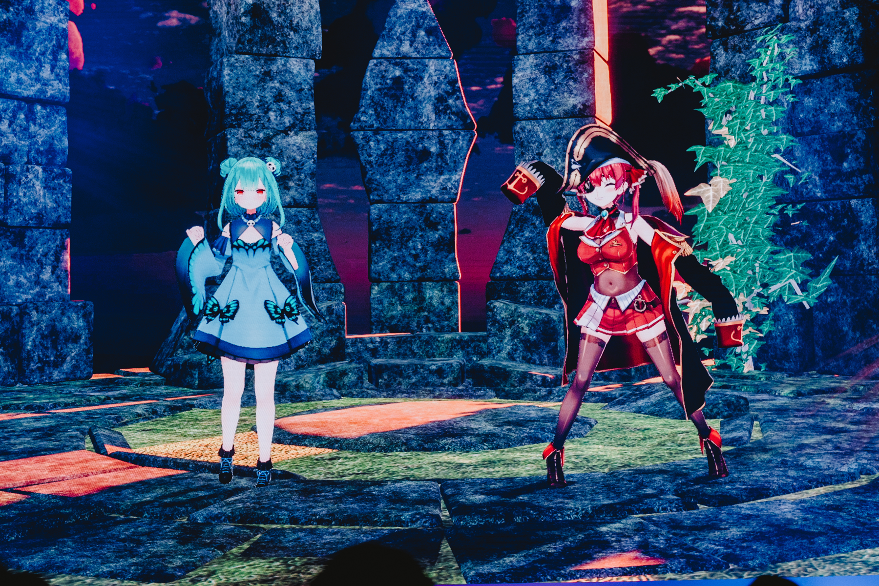 続いて、全力で歌い終わったばかりの「宝鐘マリン」を、「潤羽るしあ」が「歌おう!」と無理やり引っ張って、2人でHoneyWorks feat. 鏡音リン&鏡音レンの『スキキライ』へ。この楽曲では2人が綺麗なハモリで観客を魅了し、「そうだ、住むのは松涛あたりがいいな♪」という歌詞を、「そうだ、住むのはぺこらんどあたりがいいな♪」と普段の配信でお馴染みの歌詞に変えていく。歌詞に合わせて最後に2人でハートをつくって消す振り付けも印象的だった。
