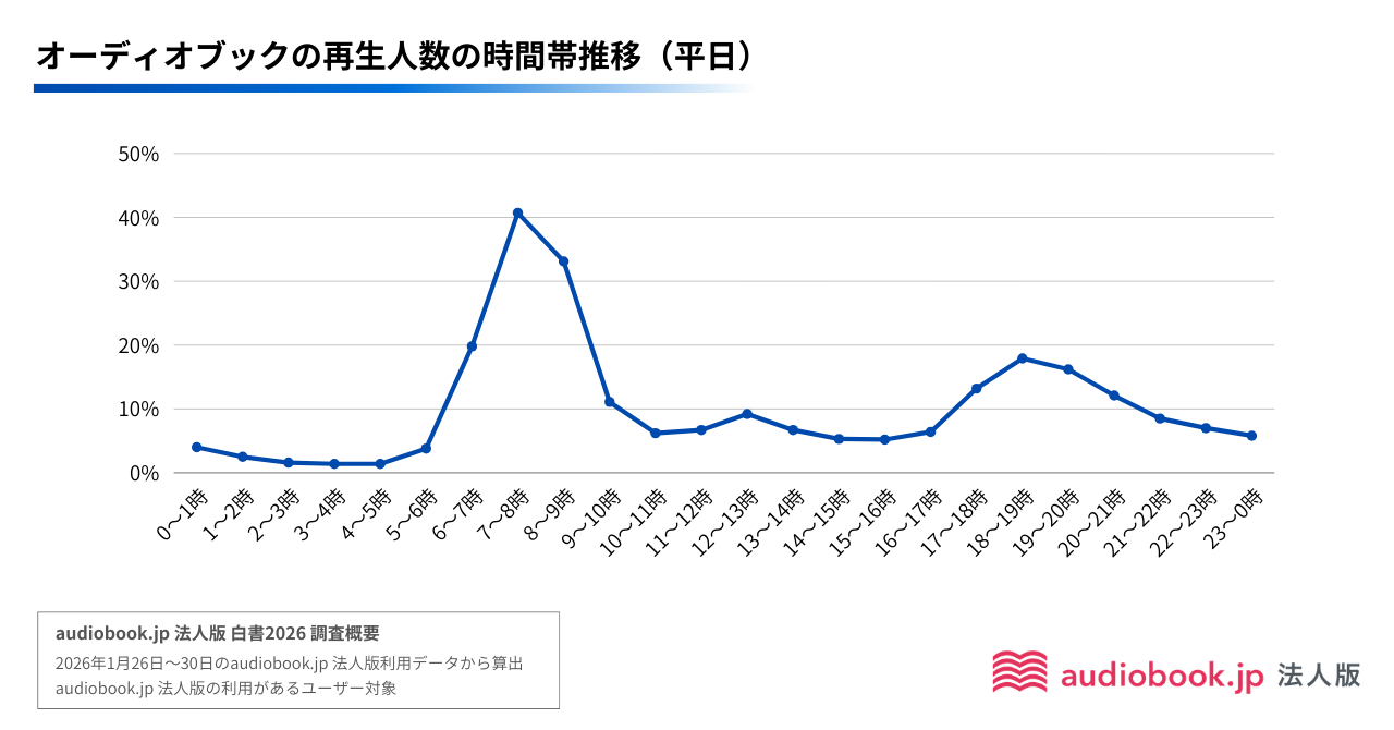 オーディオブックの利用シーンを問うと、「通勤・移動中」が81.8%と断トツの結果となりました。一般ユーザーに比べても法人版ユーザーは通勤利用が突出しています(※3)。 1月の平日利用データ(※4)でも、朝(7〜8時)と夕方(18〜19時)に明確なピークがあり、通勤時間を学習時間へ充てている姿が見て取れます。