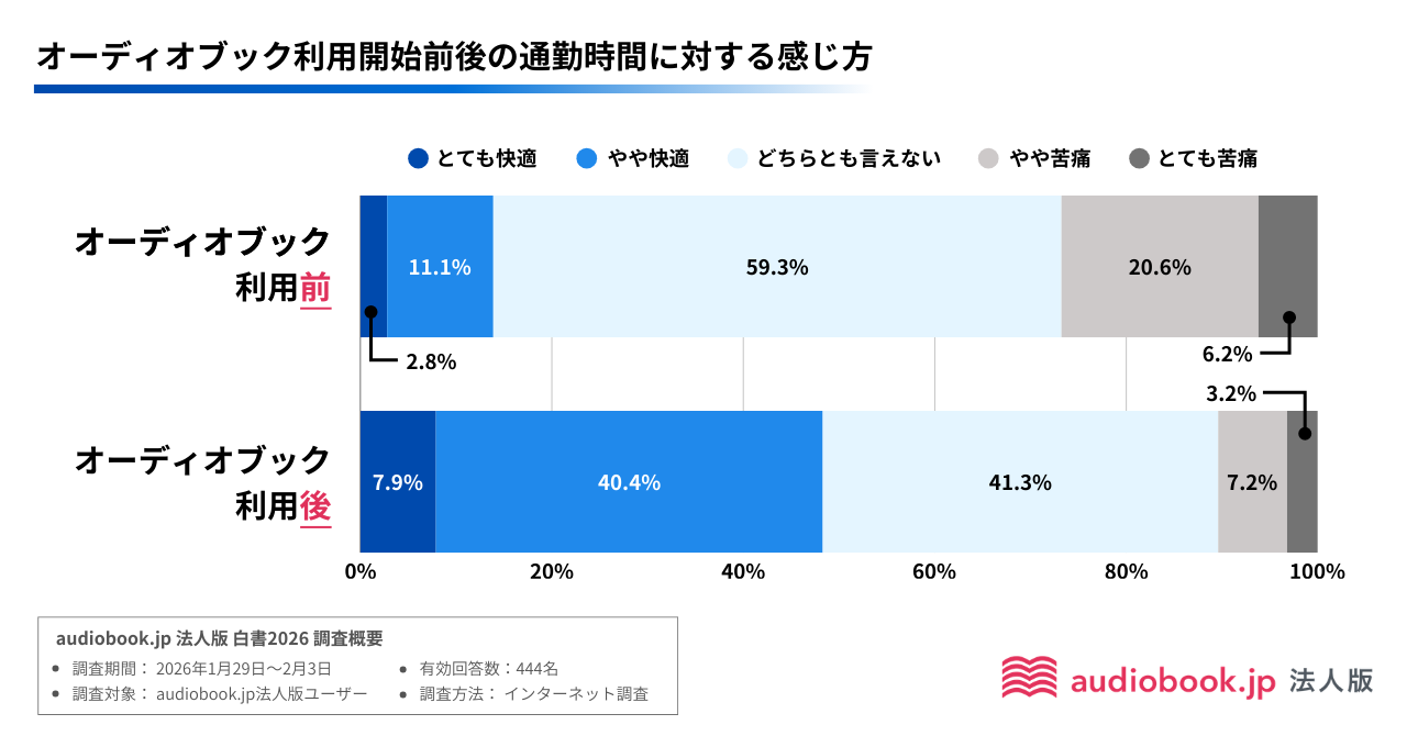 本白書では、audiobook.jp 法人版ユーザーへのアンケートおよび利用データをもとに、オーディオブックが通勤時間の価値をどのように変化させているのかを調査しました。