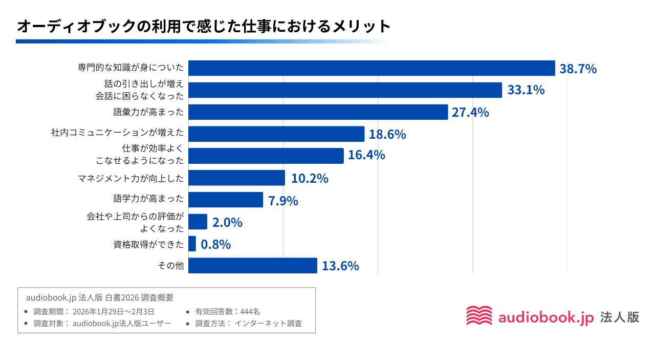 オーディオブックが仕事に役立ったと実感したかという質問に対しては、79.7%が「実感した」と回答(「実感した」21.8%、「やや実感した」57.9%)。具体的なメリットとして、「専門的な知識が身についた」(38.7%)や「話の引き出しが増え会話に困らなくなった」(33.1%)、「語彙力が高まった」(27.4%)が上位に挙がり、実務に直結する効果が確認されました。