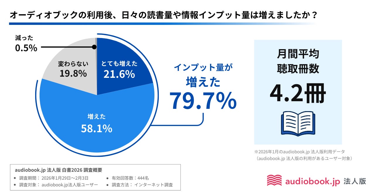 audiobook.jp 法人版ユーザーに、オーディオブックの利用後、日々の読書量や情報インプット量が増えたかについて聞くと、79.7%が「増えた」(「とても増えた」21.6%、「やや増えた」58.1%)と回答しました。2026年1月の利用データ(※2)では、1ヶ月の平均聴取冊数は4.2冊となっており、年間50冊を超えるハイペースなインプットが習慣化されています。