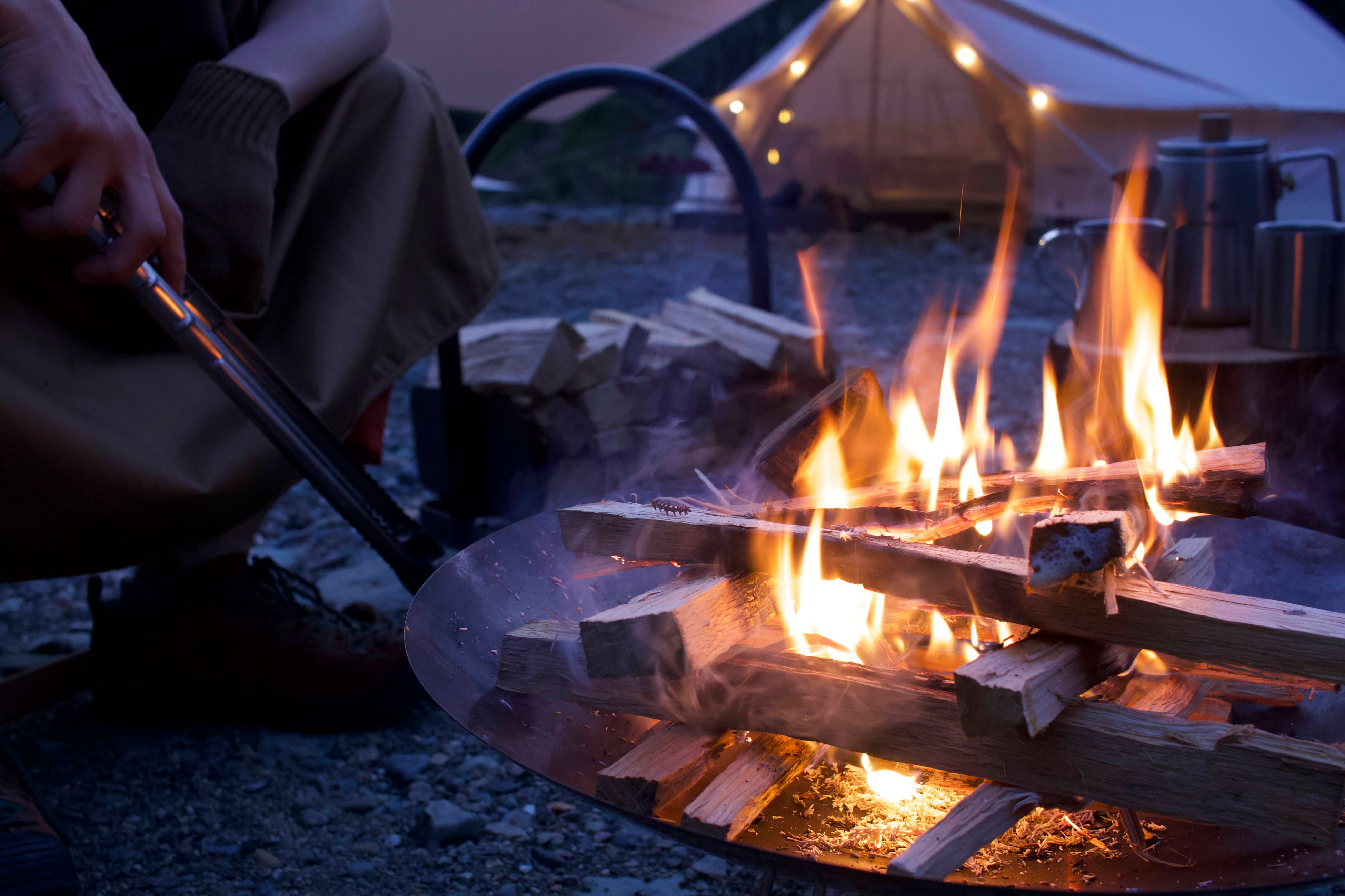 ときがわ町は面積の7割が山林を占める『木のくに』。そんな自然豊かな町でとれた木材を、ご自身で薪にするところからお楽しみいただきます。敷地内の各所に設置された専用の焚き火エリアで火を囲みながらのひとときをお過ごしください。