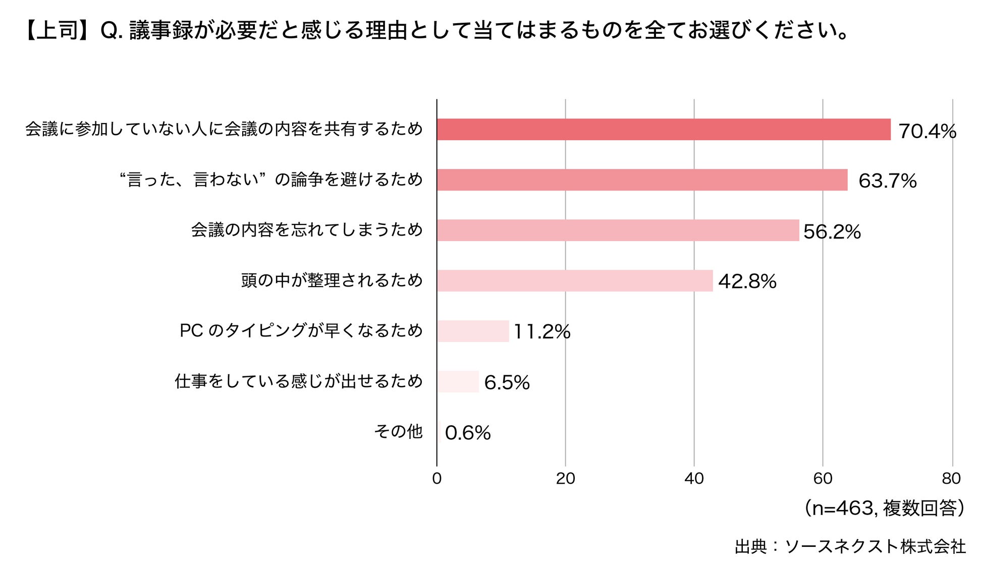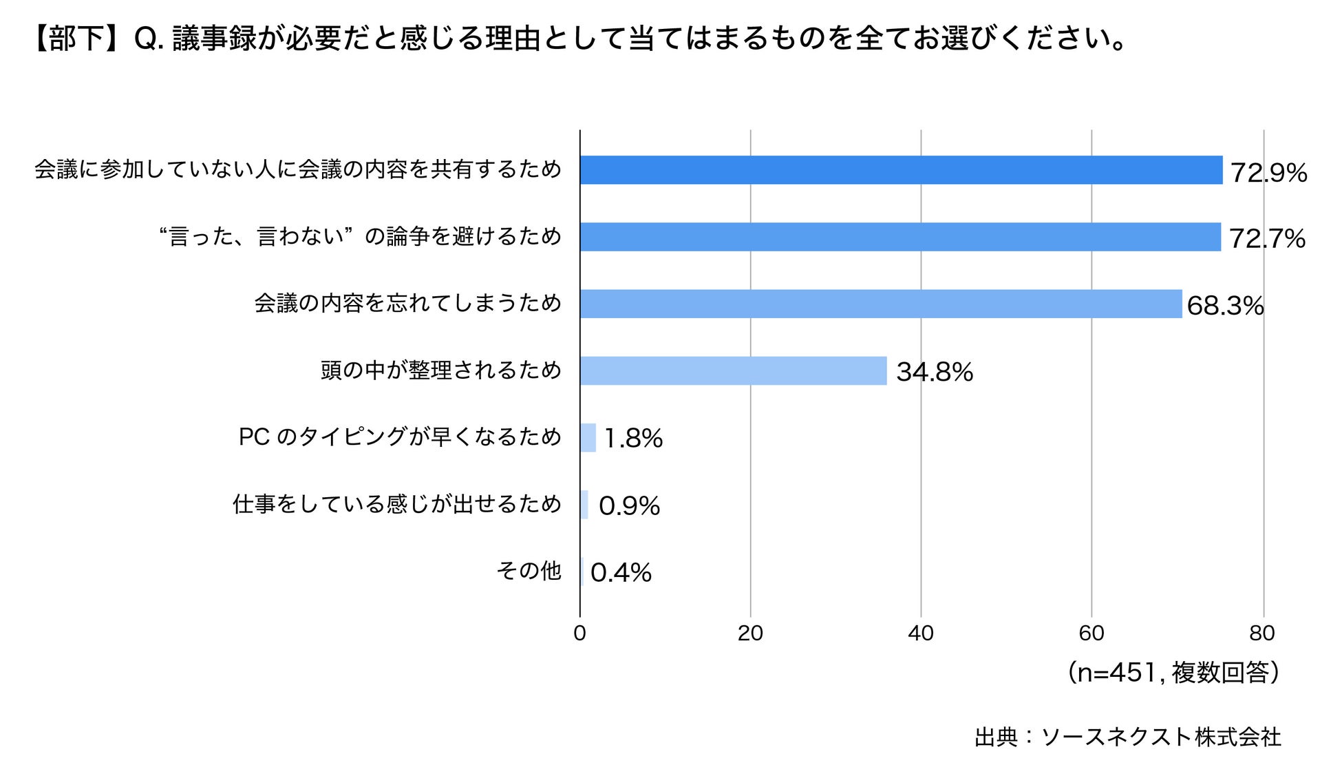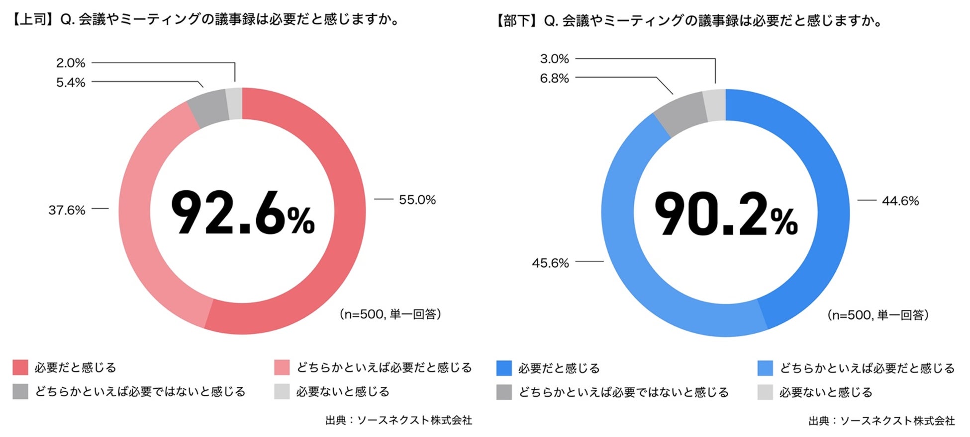上司と部下に、会議やミーティングの議事録は必要だと感じますかと聞いたところ、上司の92.6%、部下の90.2%が必要と回答しました。また、必要と回答した方に対して、その理由を聞いたところ、第1位は上司・部下ともに「会議に参加していない人に会議の内容を共有するため(上司:70.4%、部下:72.9%)という結果に。第2位も、上司・部下ともに、「“言った、言わない”の論争を避けるため(上司:63.7%、部下:72.7%)となりました。