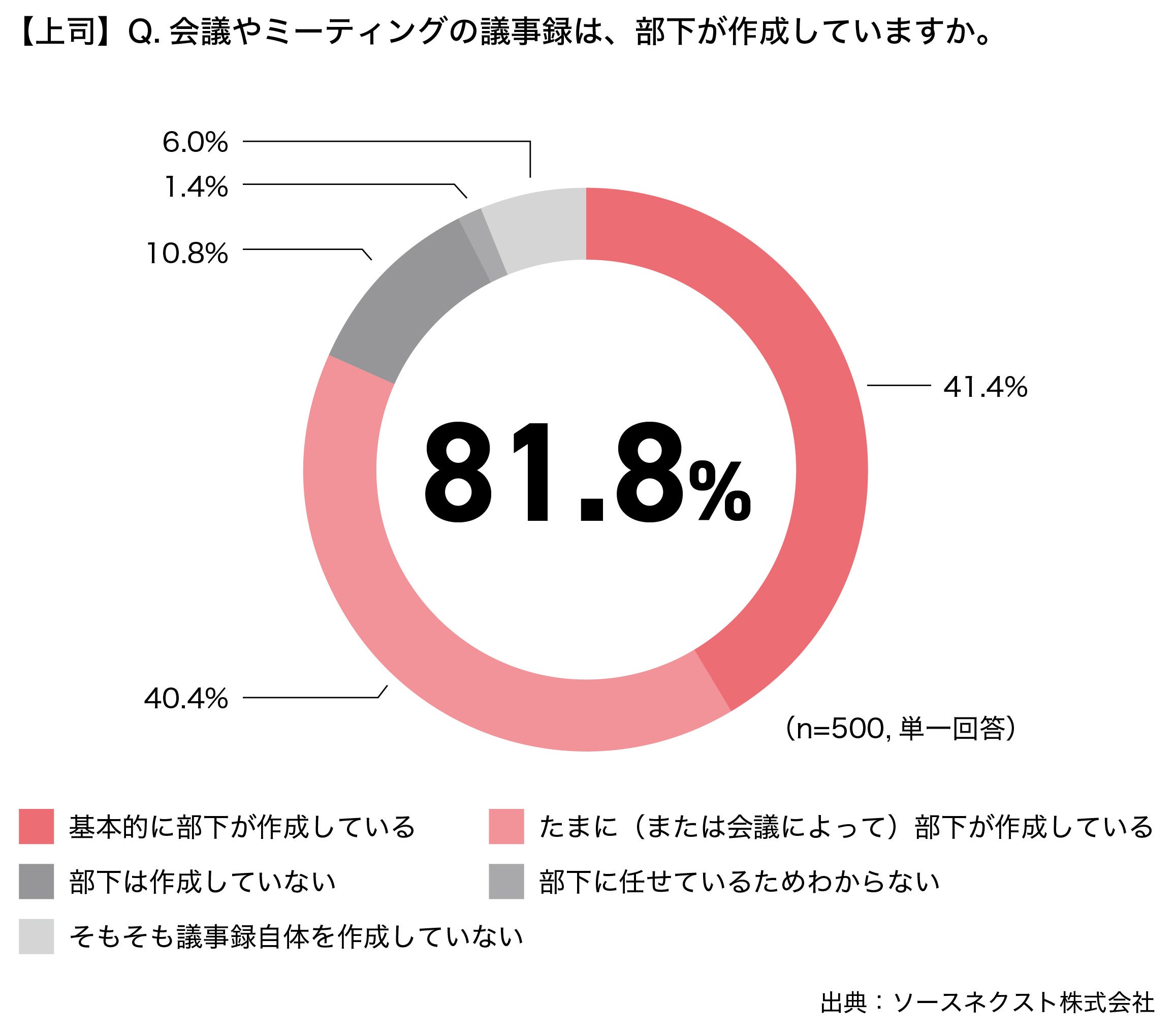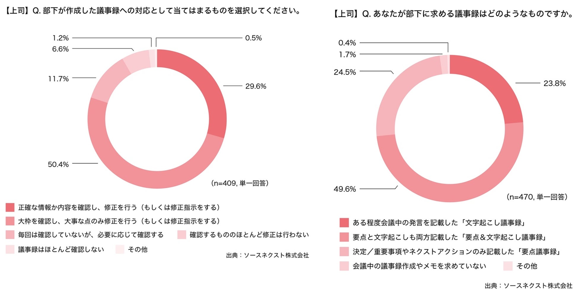 また、上司に対して、部下が作成した議事録への対応について聞くと、第1位が「大枠を確認し、大事な点のみ修正を行う(もしくは修正指示をする)(50.4%)」、第2位が、「正確な情報か内容を確認し、修正を行う(もしくは修正指示をする)(29.6%)」という結果となり、8割の上司に修正依頼などの手間がかかっていることがうかがえます。