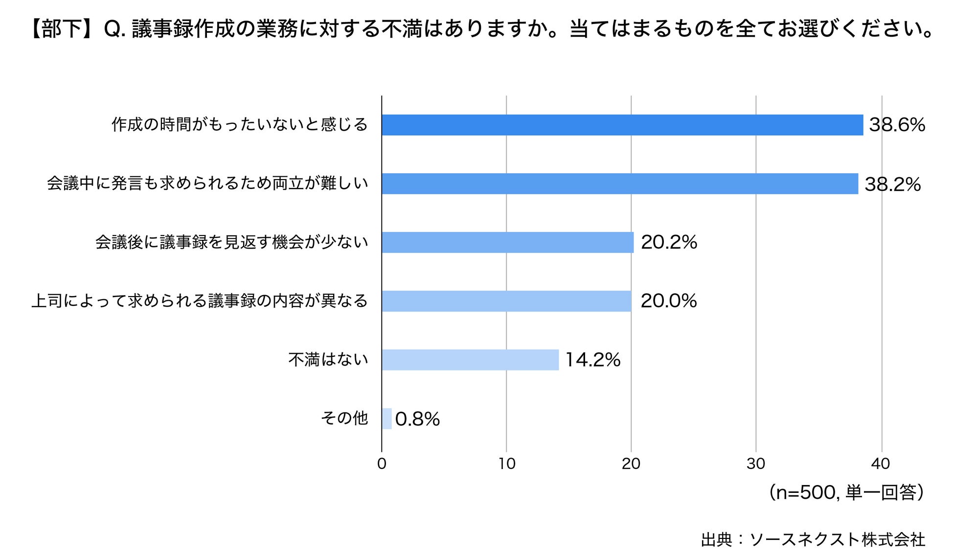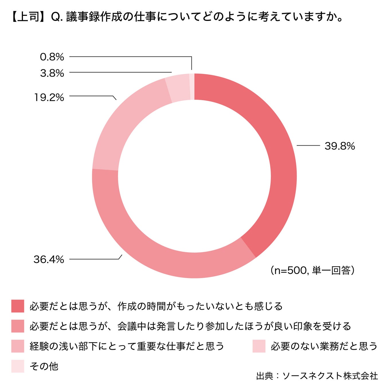 さらに、上司に対して、議事録作成の仕事についてどのように考えていますかと聞くと、「必要だとは思うが、作成の時間がもったいない(39.8%)」に次いで、第2位に「必要だとは思うが、会議中は発言したり参加したほうが良い(36.4%)」がランクインするなど、上司、部下共に、会議においては意見や発言をすることに価値があると考えていることがわかりました。