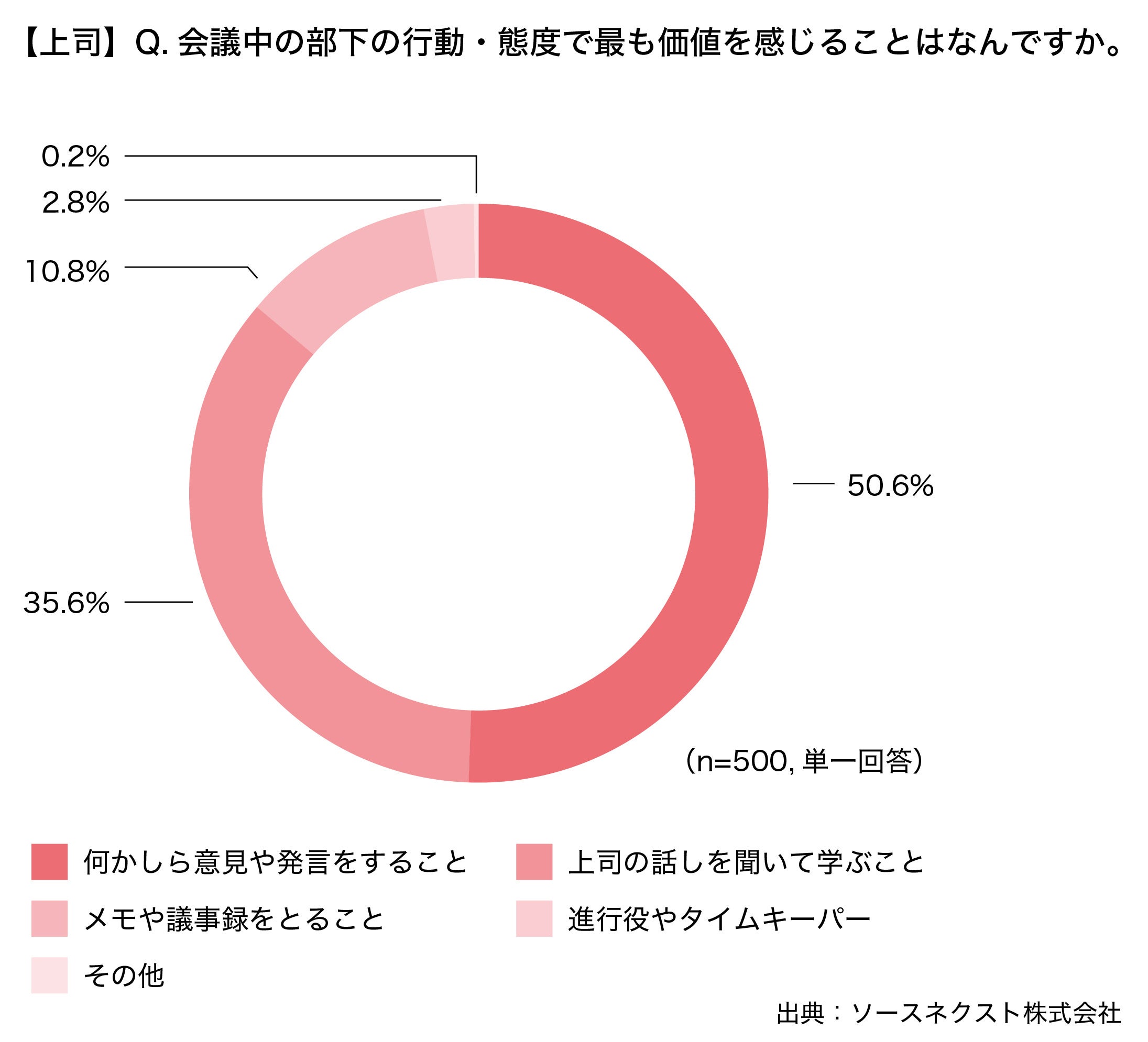 企業のマネジメント層(以下、上司)に対して、会議中の部下の行動・態度で最も価値を感じることは何かと聞いたところ、「何かしら意見や発言をすること」と答えた人が50.6%と第1位に。次いで、「上司の話しを聞いて学ぶこと(35.6%)」、「メモや議事録をとること(10.8%)」、「進行役やタイムキーパー(2.8%)」という結果となりました。