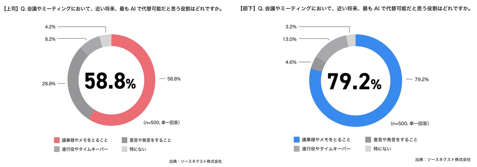 上司に対して、会議やミーティングにおいて近い将来最もAIで代替可能だと思う役割について聞いたところ、第1位が「議事録やメモをとること(58.8%)」、第2位が「意見や発言をすること(28.8%)」、第3位は「進行役やタイムキーパー(8.2%)」という結果に。同じ質問を部下にしたところ、第1位は「メモや議事録をとること(79.2%)」、次いで「進行役やタイムキーパー(13%)」、「意見や発言をすること(4.6%)」という結果となりました。