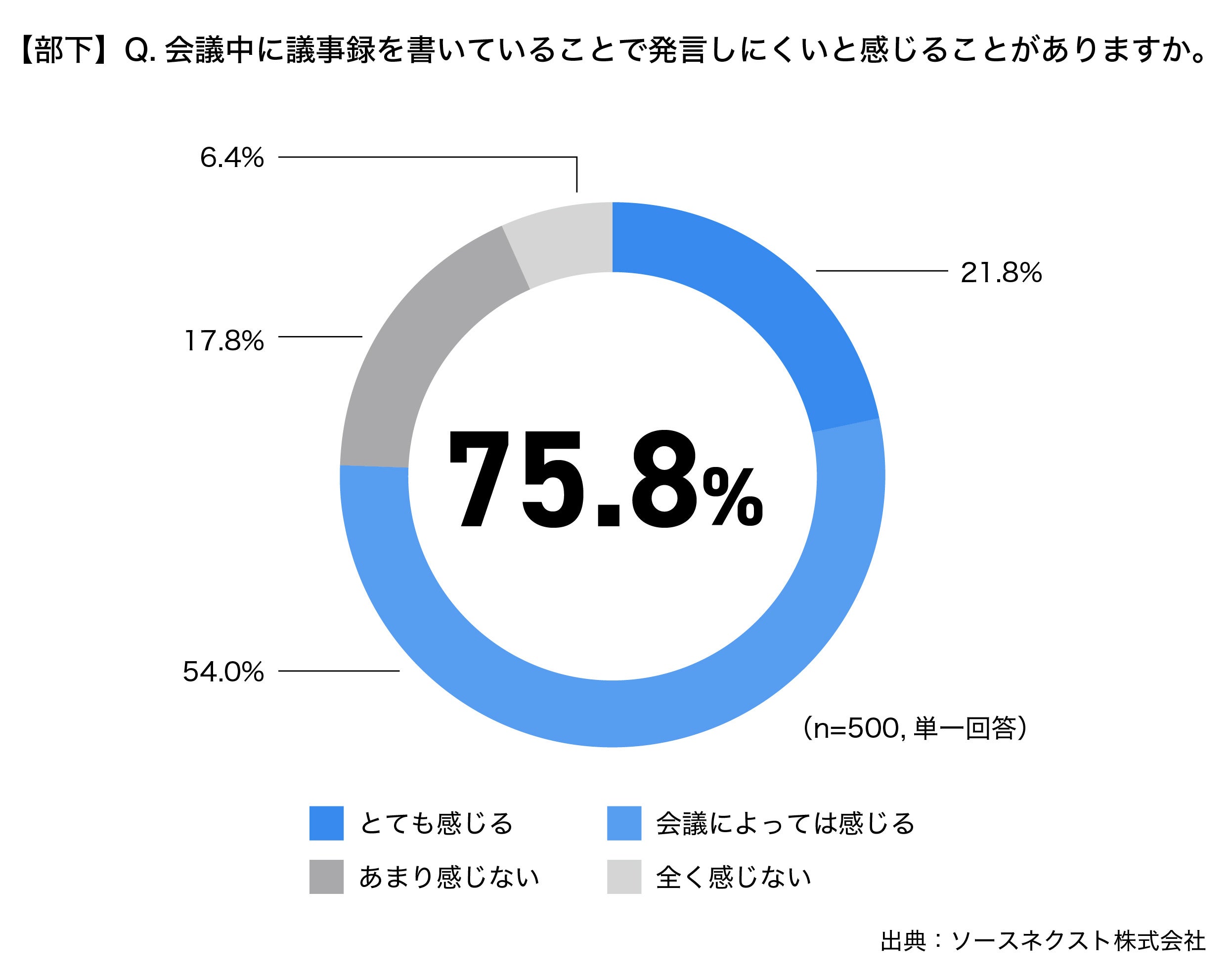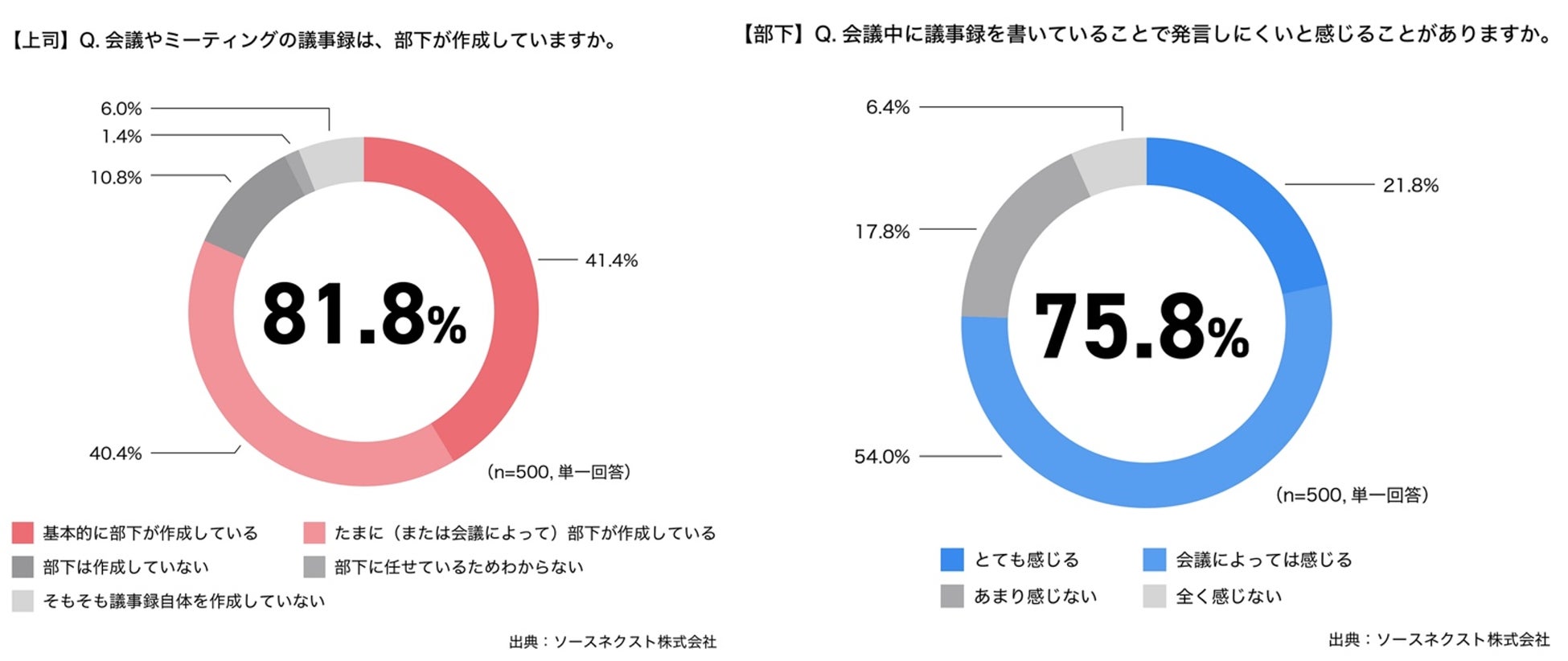 上司に、会議やミーティングの議事録は部下が作成していますかと聞いたところ、81.8%が部下に依頼していることが分かりました。また、部下に、議事録作成の業務に対する不満はありますかと聞いたところ、「作成の時間がもったいないと感じる(38.6%)」に次いで、第2位に、「会議中に発言も求められるため両立が難しい(38.2%)」がランクイン。さらに、部下に対して、会議中に議事録を書いていることで発言しにくいと感じることがありますかと聞くと、「とても感じる」が21.8%、「会議によっては感じる」が54.0%と、合計で75.8%もの人が議事録作成によって会議中の発言がしにくくなっていることが分かりました。
