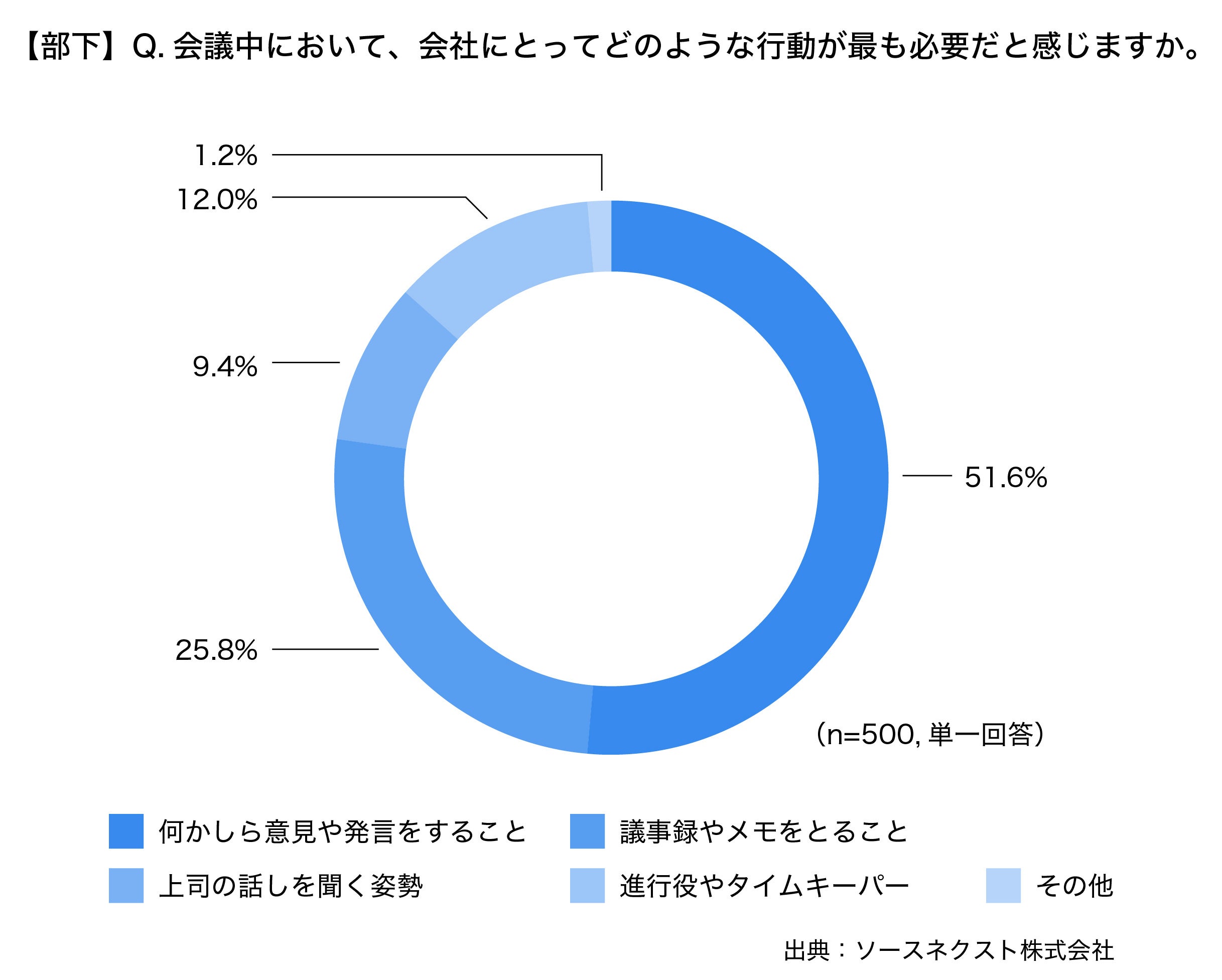また、議事録を作成する機会がある会社員(以下、部下)への、会議中において会社にとってどのような行動が最も必要だと感じますかという質問に対しては、第1位が、「何かしら意見や発言をすること(51.6%)」、次いで「議事録やメモをとること(25.8%)」、「進行役やタイムキーパー(12%)」、「上司の話しを聞く姿勢(9.4%)」という結果となりました。
