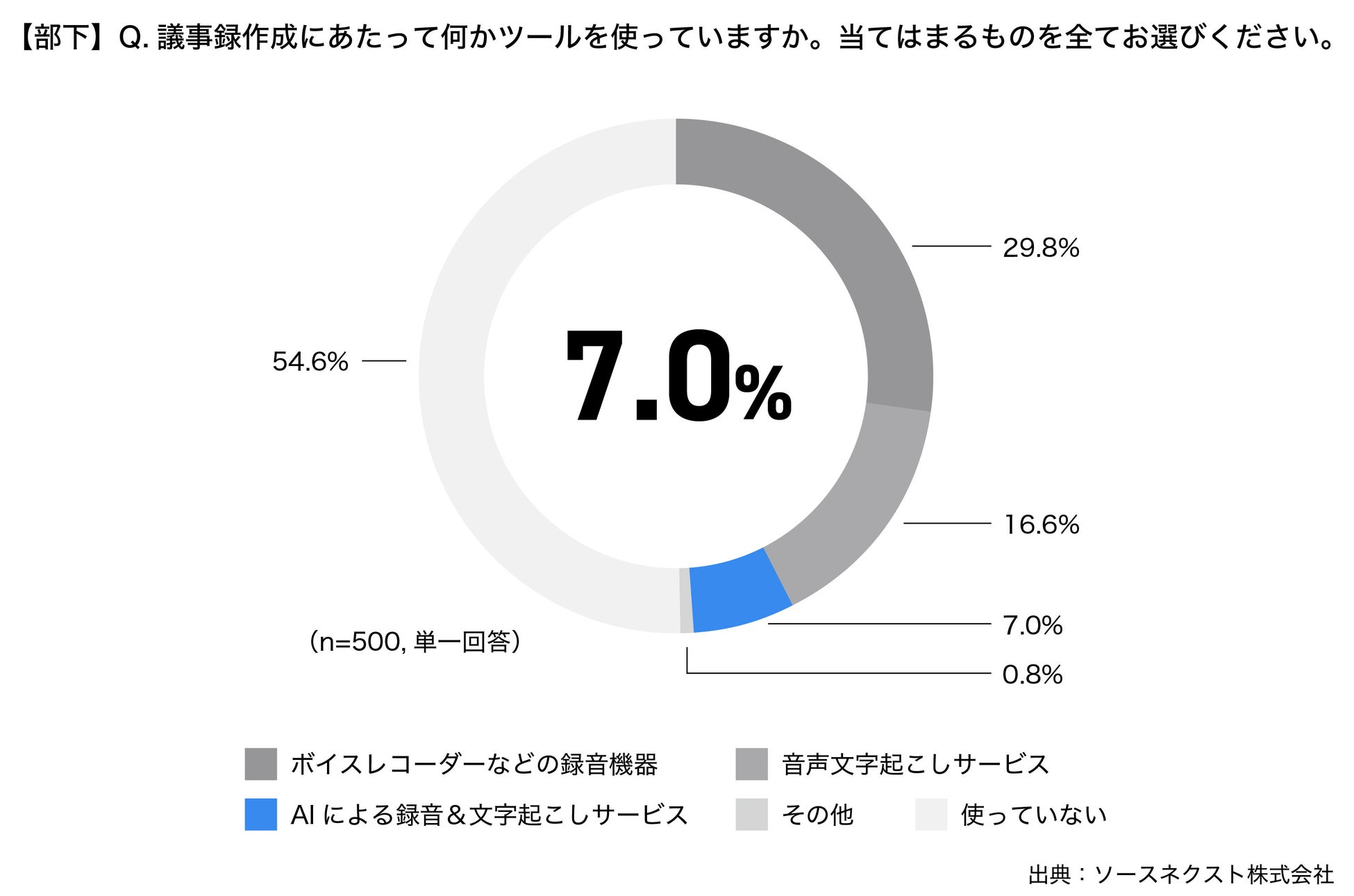 また、部下への議事録作成にあたって何かツールを使っていますかという問いには、「使っていない(54.6%)」が最も多い結果に。次いで、「ボイスレコーダーなどの録音機器(29.8%)」、「音声文字起こしサービス(16.6%)」、さらに「AIによる録音&文字起こしサービス」を、利用している人はわずか7%のみとなっており、ChatGPTなどAIを活用したサービスが世界的に大流行している一方で、まだ企業の現場には浸透していないことがうかがえます。