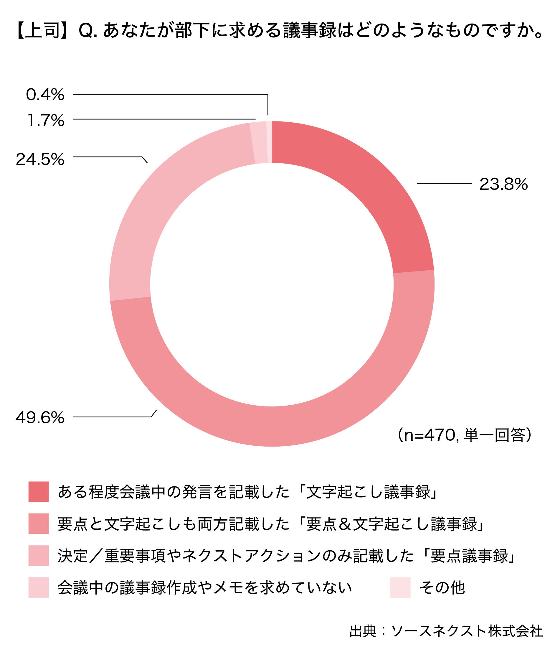上司に、あなたが部下に求める議事録はどのようなものですかと聞いたところ、「要点と文字起こしも両方記載した『要点&文字起こし議事録』(49.6%)」が第1位という結果となりました。議事録作成という業務においては、上司、部下共に一定の作業時間が会議とは別途発生しており、会社にとって見えにくいコストになっている可能性があります。