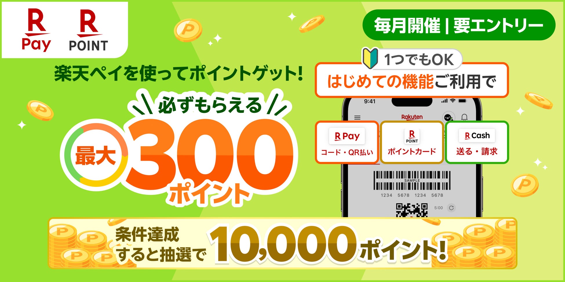 「楽天ペイ」アプリ、最大10,300ポイント還元「まずはここから!楽天ペイを使ってポイントをゲットしよう!」キャンペーンを実施