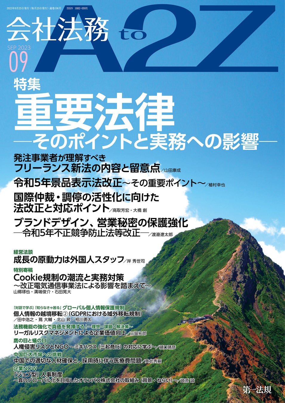 【会社法務A2Z】最新の企業トレンドや法改正情報の解説を毎月お届け!2023年9月号特集は企業は"重要法律-そのポイントと実務への影響-”!