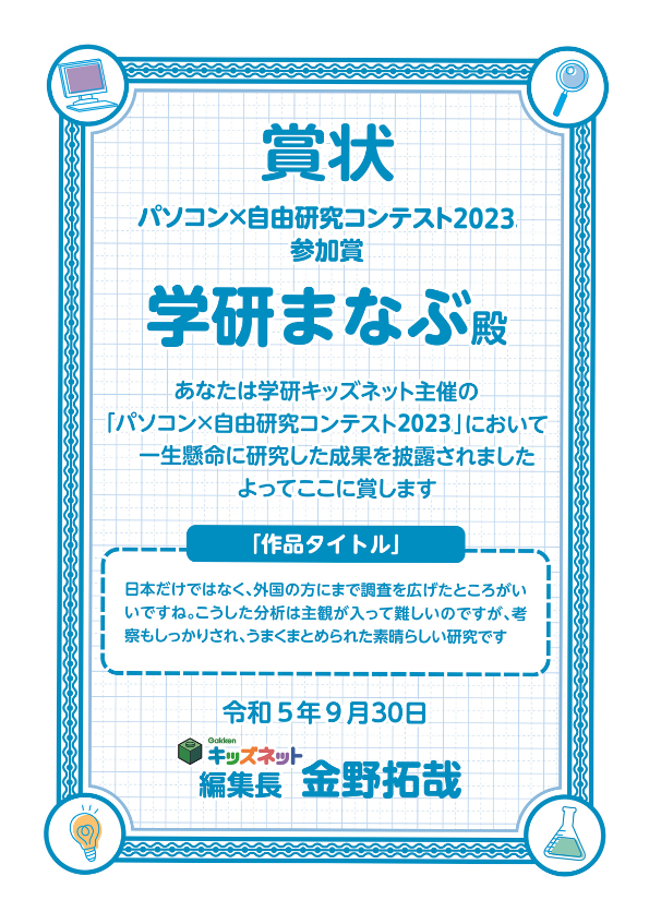 ・郵送の送付先:〒110-0005 東京都台東区上野3-24-6 上野フロンティアタワー14F(株)ワン・パブリッシング 第1メディアプロデュース部 学研キッズネット編集部 「パソコン×自由研究コンテスト2023」事務局