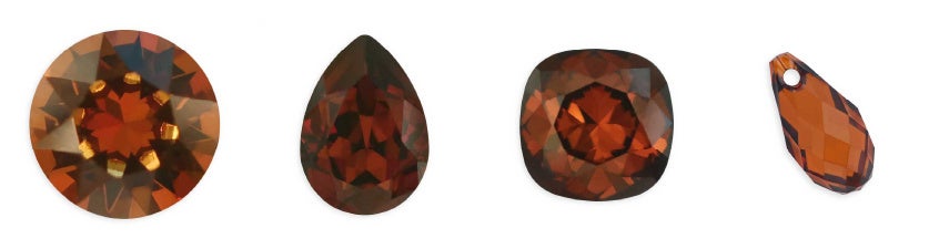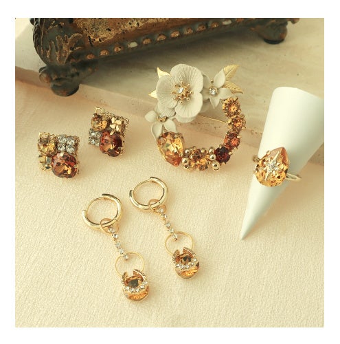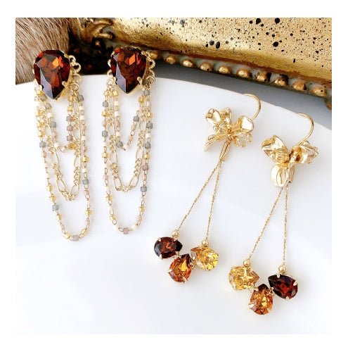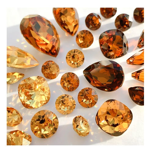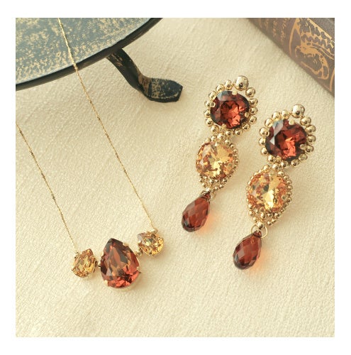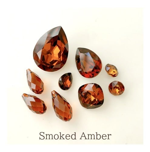 紅茶のような色合いが特徴の「スモークアンバー」はライトアンバーより深みと色の濃さが増したクリスタルです。明るめのコーディネートに対するアクセントカラーとして活躍することでしょう。
