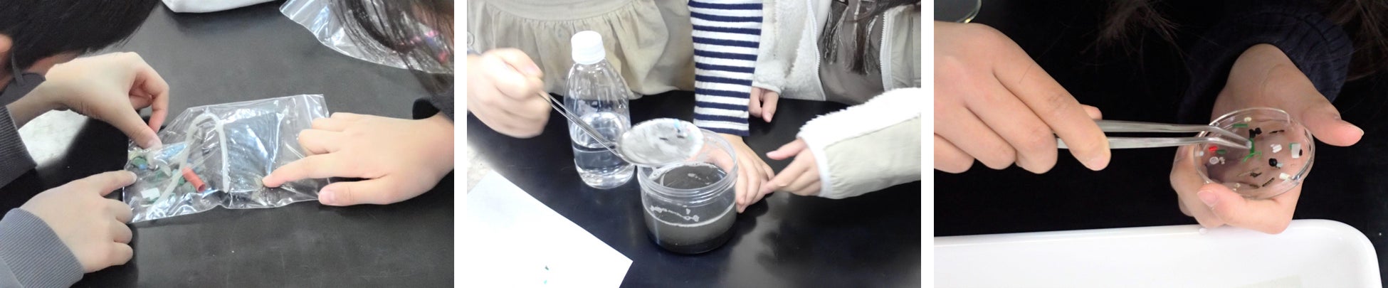 その後、本日のメインの活動である海岸の砂のプラスチックごみ調査に入りました。今回、湾岸生物教育研究センターの協力により特別に海岸の砂を送ってもらい、その中にプラスチックごみが含まれているのか調べました。砂と水を混ぜることで、水に浮く物とそうでないものに分け、どのような物が含まれるているか観察しました。すると植物や海藻の破片だけでなく、さまざまな形や色の破片がたくさん見つかりました。見つかったものはプラケースにしまいました。