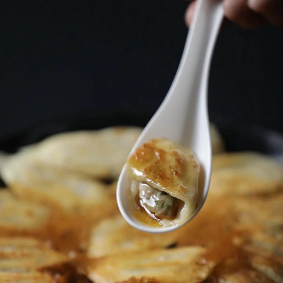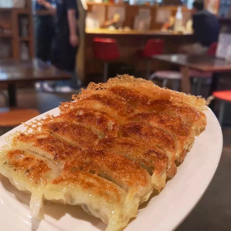 パリッと焼かれた皮の食感と、モチっとした皮の食感を両方楽しめ、噛むと、肉と野菜の汁がジュワー!! ビールのおつまみにも最高です。