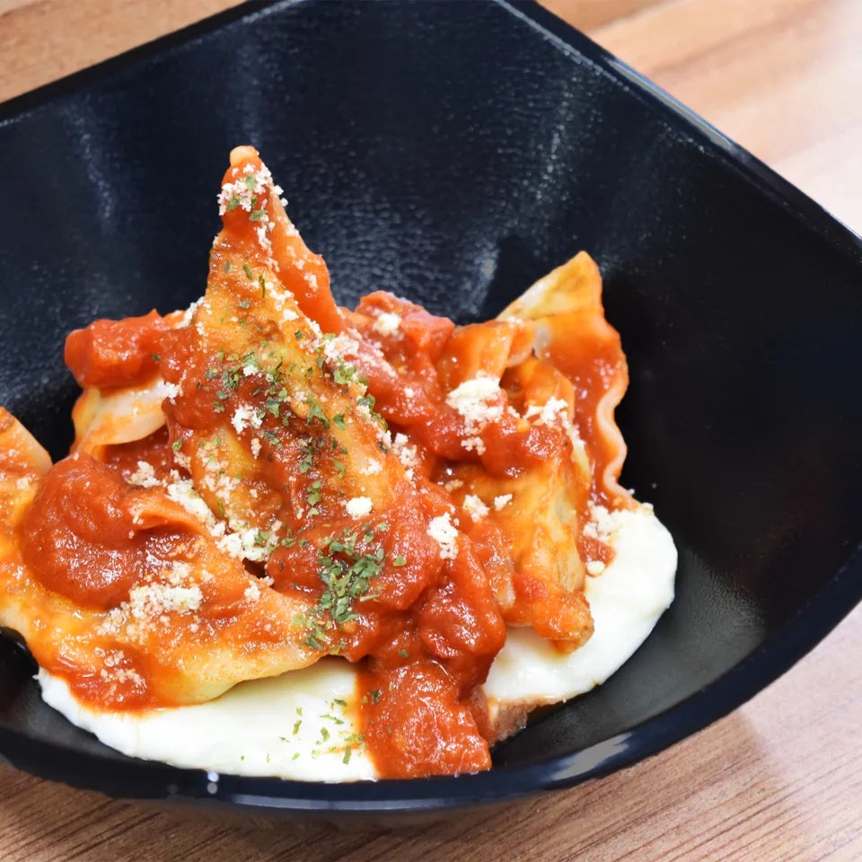 モチモチの餃子の皮に濃厚なトマトソースとベシャメルソースは相性抜群!ラザニアを超えていけ。ぜひ!