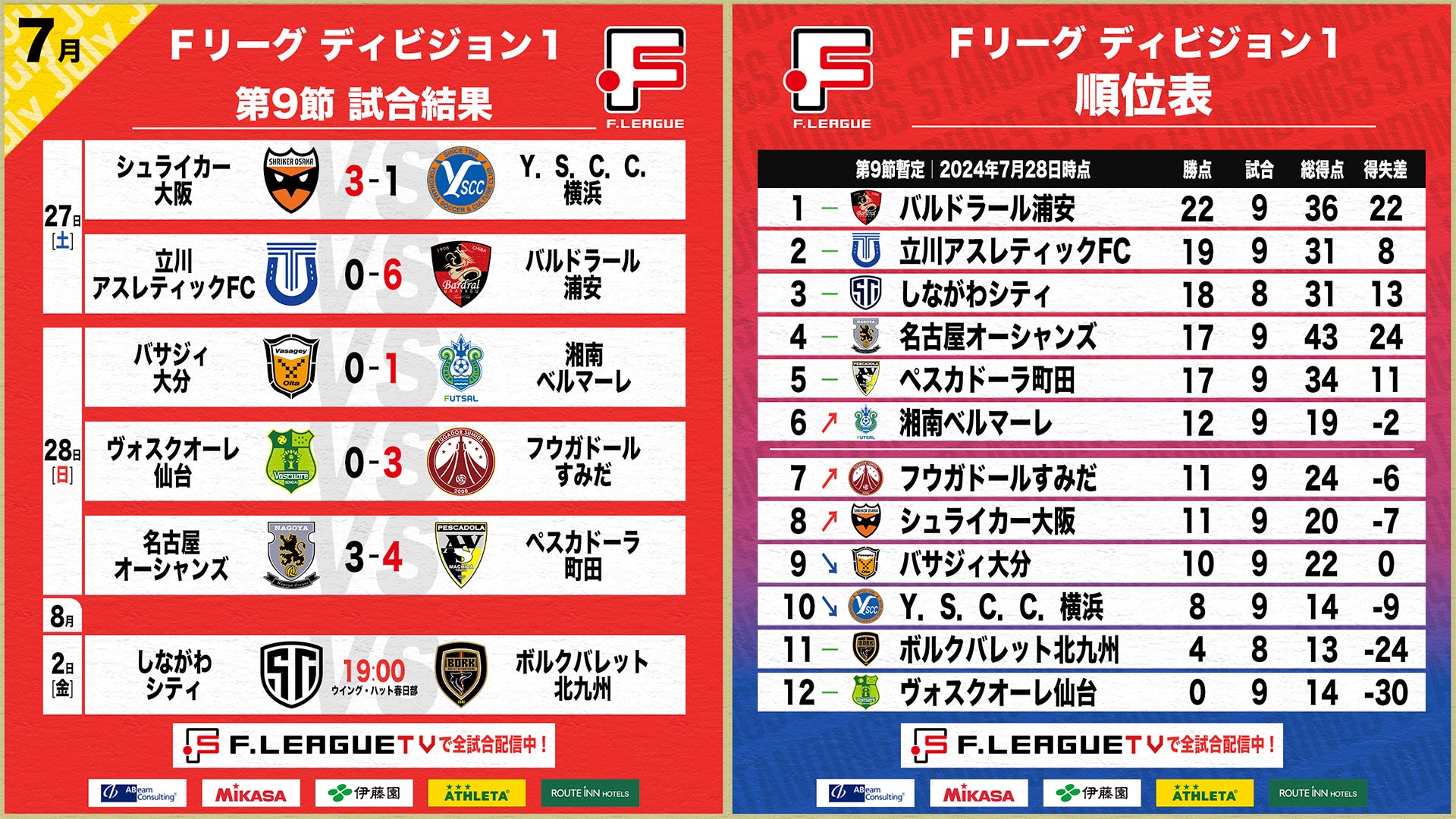 7月27日(土)・28日(日)の2日間で実施されたFリーグ2024-2025 ディビジョン1 第9節の5試合について結果をお知らせいたします。