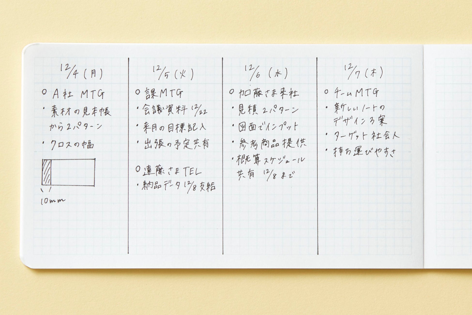 PCの前に開いて置けるスマートサイズのノートです。フラットに開ける製本のため、PC前に置いてもタイピングの妨げになりません。カラーはオレンジ、ペールグリーン、ブルーグレー、チャイロ、ネイビー、シロの6色展開で、用途や案件ごとにカラーを使い分けることもできます。
