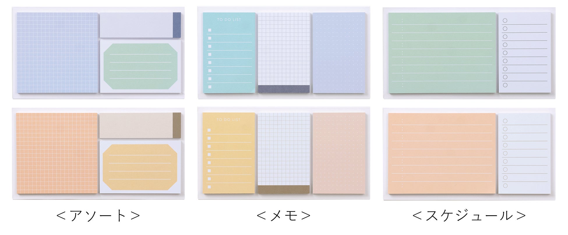 効率的な仕事をサポートする便利なフォーマットを1冊に詰め込んだふせんです。台紙は2way仕様で、デスクにスタンドさせたり、持ち運ぶ際にカバーにしたりすることができます。フォーマットは「Assort(アソート)」「Memo(メモ)」「Schedule(スケジュール)」の3種類で、仕事のスタイルに合わせて選べます。カラーは、各2色展開です。