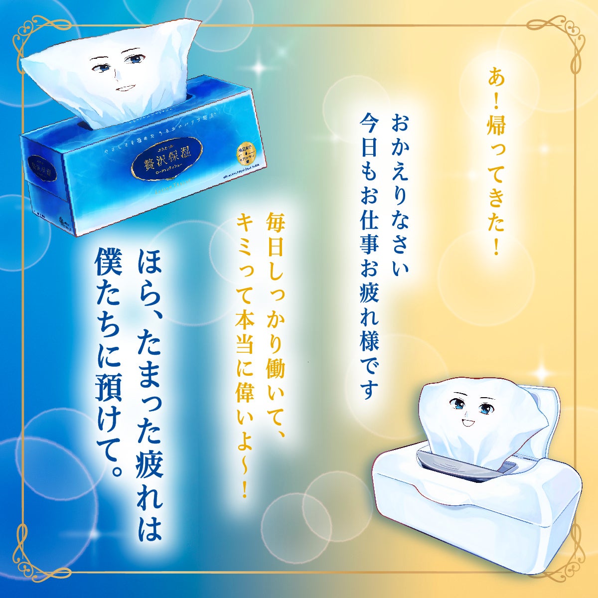 “やさしい紳士系”の兄「贅沢保湿ティシューくん」役を昨年に続き小野賢章さんが務め、“ピュアで一途な子犬系”の弟「贅沢保湿ウエットティシューくん」役には、アニメ『鬼滅の刃』の主人公・竈門炭治郎役を務める声優・花江夏樹さんを起用。“史上最高にやさしい彼紙”の贅沢保湿兄弟が“最高にやさしいメッセージ”をささやき、花粉症や乾燥によって気分が落ち込みがちな季節に、お肌だけでなく心にも“最高のやさしさ”をお届けします。