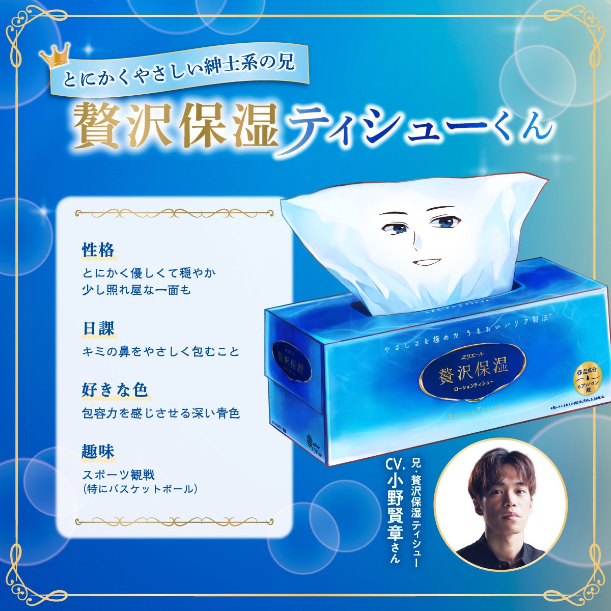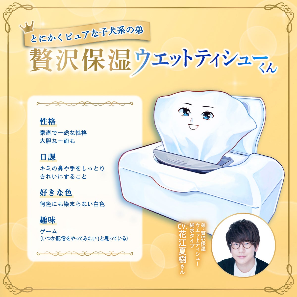 “やさしい紳士系”の兄「贅沢保湿ティシューくん」(小野賢章さん)と“ピュアで一途な子犬系”の弟「贅沢保湿ウエットティシューくん」(花江夏樹さん)が、“最高にやさしいボイス”で憂鬱になりがちな花粉症や乾燥の季節に寄り添います。