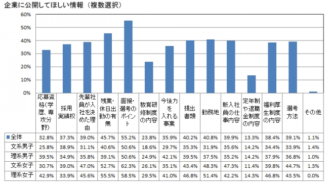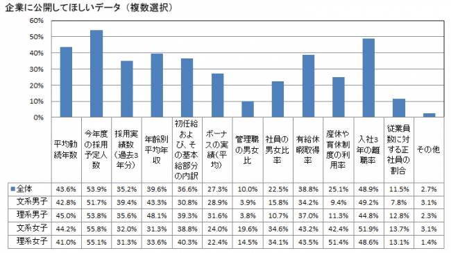 学生に「企業に公開してほしいデータ」について聞いたところ(複数選択)、「今年度の採用予定人数」(53.9%)、「入社3年の離職率」(48.9%)、「平均勤続年数」(43.6%)が上位となった。また、「企業に公開してほしい情報」(複数選択)では、「面接・選考のポイント」(55.2%)、「残業・休日出勤の有無」(45.7%)が上位となった。採用に関する情報に加え、働き始めてからの具体的な労働環境に関する情報を公開してほしいと感じている学生が多いようだ。文理男女別で見ると、「年齢別平均年収」では男子の回答割合が高く(文系男子:43.3%、理系男子:48.1%、文系女子:31.3%、理系女子:33.6%)、「産休や育休制度の利用率」(文系男子:9.4%、理系男子:11.3%、文系女子:42.4%、理系女子:51.4%)や、「勤務地」(文系男子:31.9%、理系男子:37.5%、文系女子:48.3%、理系女子:51.4%)では女子の回答割合が高くなる結果となった。