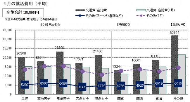 4月の就活費用については、全体の平均額が25,595円となった。「交通費・宿泊費」では、「その他エリア」(32,124円)が「関東」(13,244円)や「関西」(16,601円)の約2倍となった。前月と比較しても、「その他エリア」は「関東」「関西」に比べて増加幅が大きい。個別企業セミナーや面接が始まり、エリアをまたいで活動を行っている学生にとっては負担が大きくなり始めているようだ。