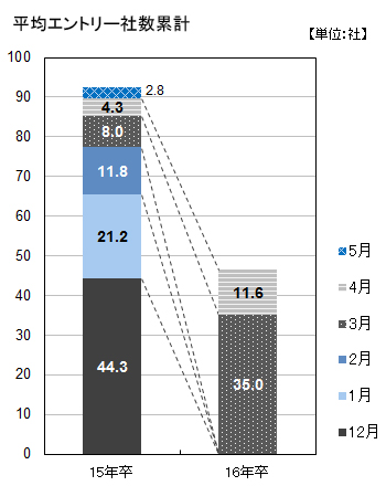 4月の活動状況を3月と比較すると、「合同企業説明会への参加」及び「大学主催のガイダンスへの出席」が大幅に減少し、エントリーシート、適性検査、面接に関する活動が増加した。個別企業セミナーに関しては、「参加予定の日程がある」(前月比3.4pt減の85.8%)、「実際に参加した」(前月比2.8pt増の89.5%)と、3月と同様に高い活動割合を示しており、これは昨シーズンと比較すると、2015年卒2月(広報活動開始3カ月目)に近い割合となった。面接を受けた学生も、1次面接では67.2%と全体の約3分の2、最終面接では20.7%と約5人に1人の割合となり、具体的な選考の進捗がうかがえる。また、4月の平均エントリー社数は11.6社となり、広報活動開始2カ月目であった2015年卒1月(21.2社)と比較すると、大きく減少した。このことからも、学生の活動が、早々にエントリーから個別企業セミナーや面接へシフトしていることが分かる。