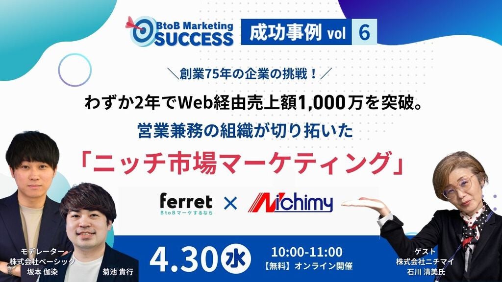 BtoBマーケティングのお困りごとをまるっと解決するサービス『ferret(フェレット)』を運営する株式会社ベーシック(本社:東京都千代田区、代表取締役:秋山勝)は、4/30(火)10時よりBtoBマーケティング担当者に向けたイベント「BtoB Marketing SUCCESS vol.6 営業兼務の組織が切り拓いたニッチ市場マーケティング」を開催いたします。