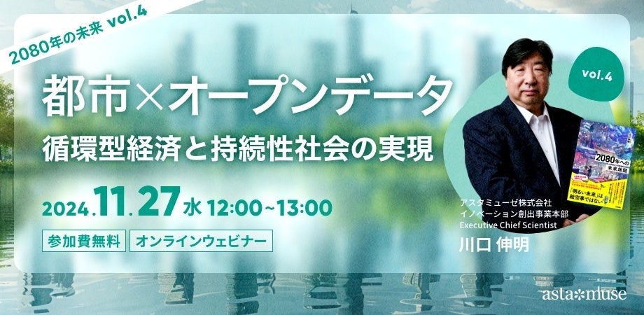 アスタミューゼ株式会社(本社:東京都千代田区、代表取締役社長 永井歩)は、2024年11月27日(水)12:00-13:00に、『2060 未来創造の白地図』および『2080年への未来地図』著者、弊社のExecutive Chief Scientistである川口伸明による無料ウェビナー「都市xオープンデータ:循環型経済と持続性社会の実現 ~2080年の未来シリーズvol.4~」を開催いたします。書籍に取り上げた技術領域や社会課題、未来世界について語るウェビナーです。