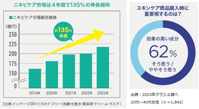 当社の調査によると、ニキビケア市場はコロナ禍以降も4年間で135%と成長を続けています。また、お客様がスキンケア商品購入時に、より効果の高い成分を重要視するということも分かりました。