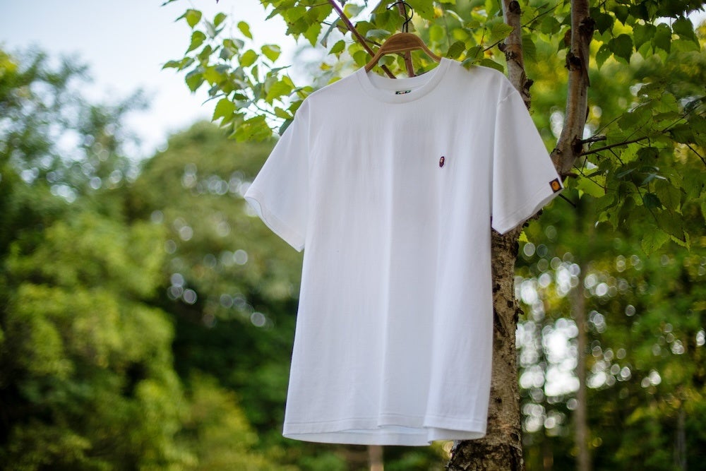 TシャツとロングスリーブTシャツは、それぞれ、ホワイト、ブラック、ベージュの3色展開。左胸にAPE HEADのワッペンを刺繍したシンプルなデザインで、背面に両ブランドのロゴをプリント。