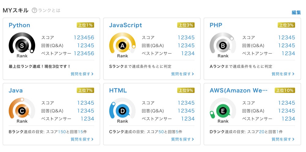 「MYスキル」のランクは回答数や獲得スコア、ベストアンサー率などの指標をもとに計算されます。AまたはSの上位ランクにおいては、技術力を正確に反映するためのteratail独自のロジックを用いて算出しているため、単に回答を重ねたりスコアを増やすだけでは達成ができない、技術力を正しく反映した仕組みです。