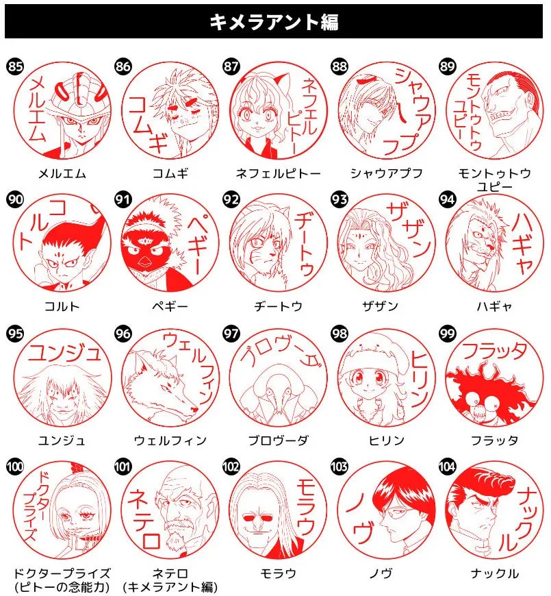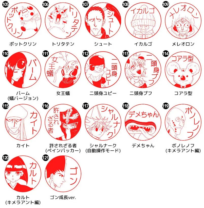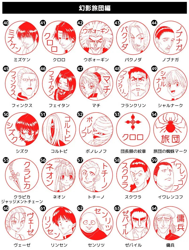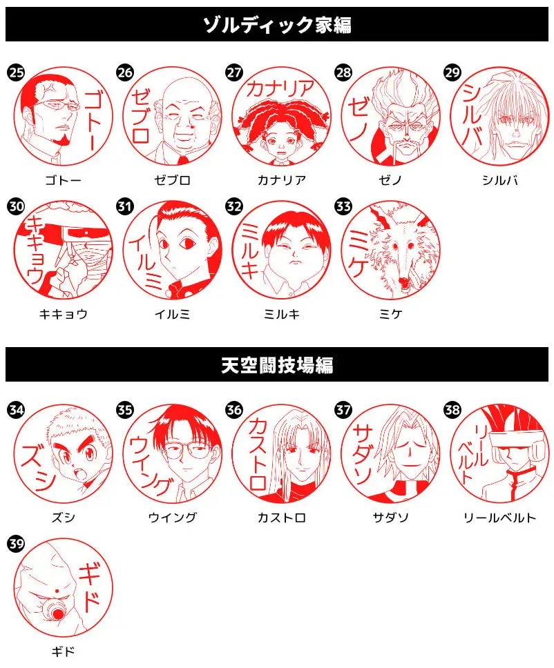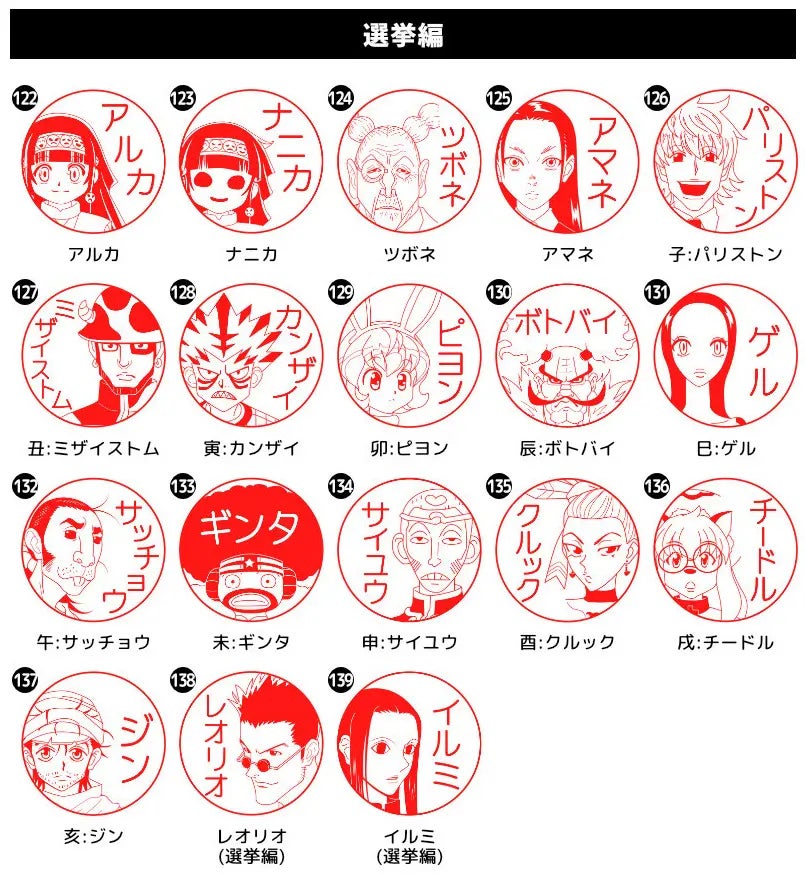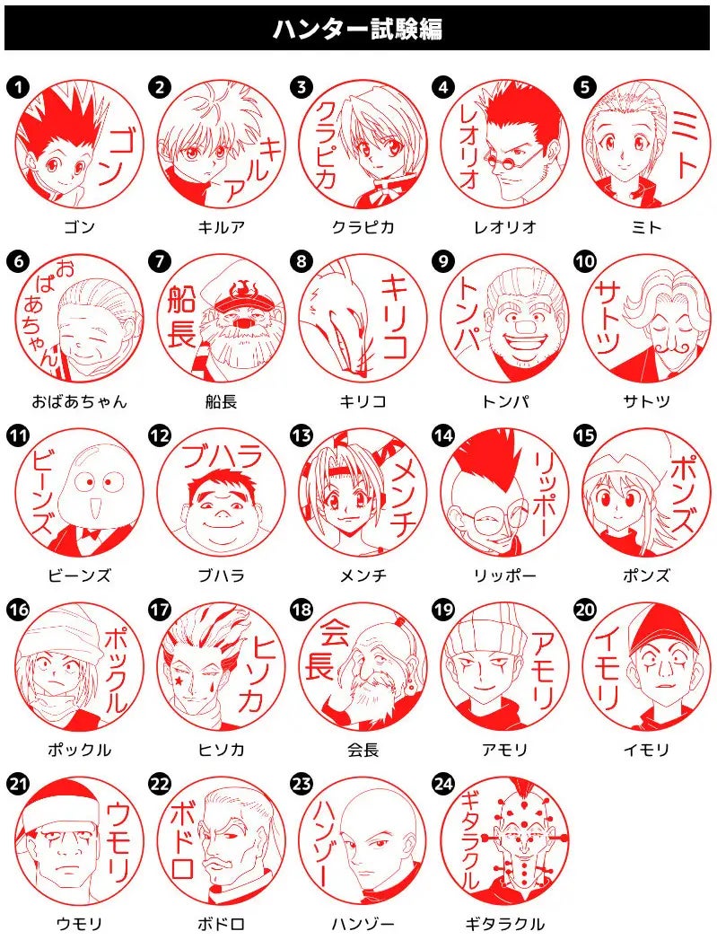 「ハンター試験編」「ゾルディック家編」「天空闘技場編」「幻影旅団編」「グリードアイランド編」「キメラアント編」「選挙編」より全139種類。サインがわりやお子さまの連絡帳、お名前つけ、銀行登録に使えます