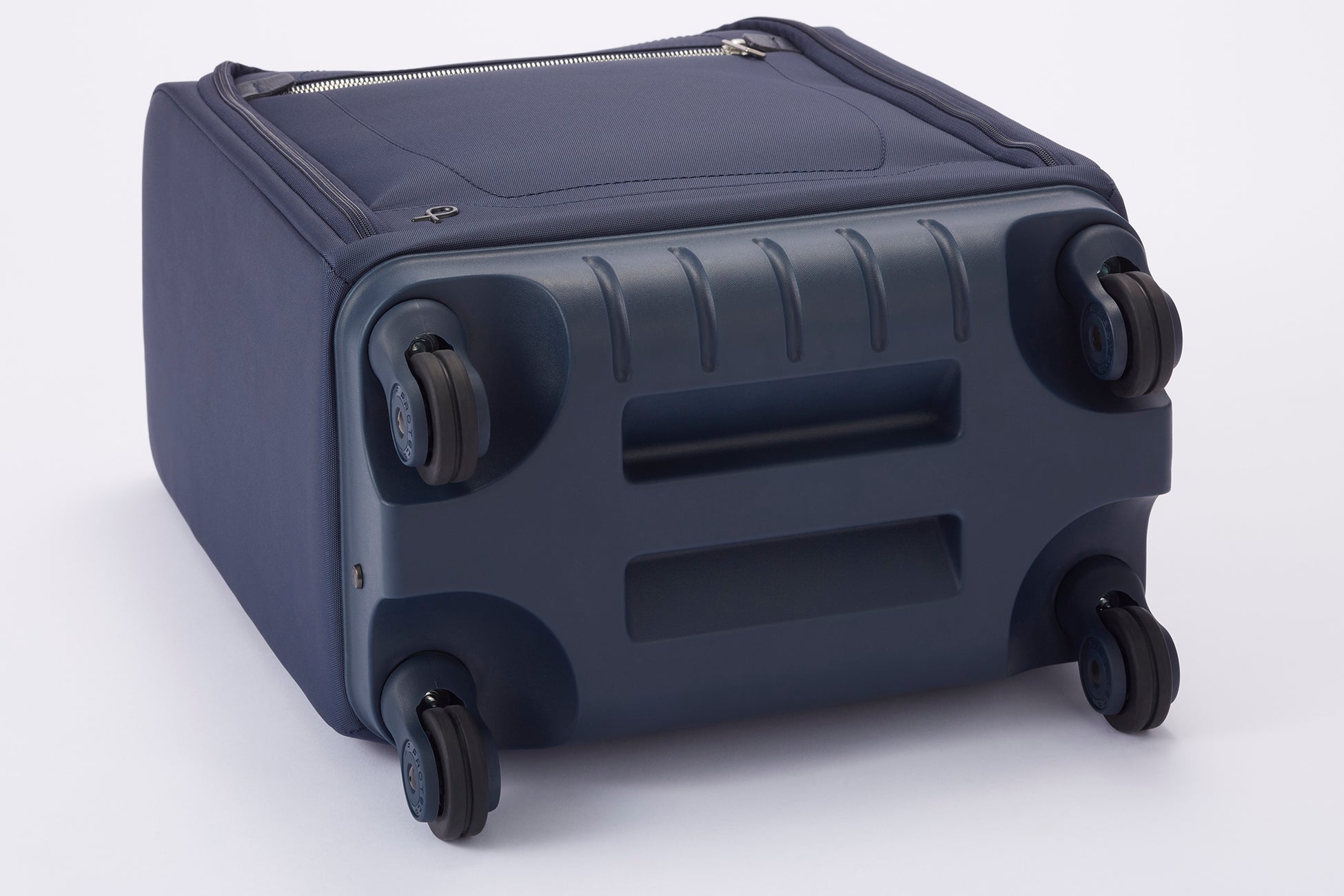ケース下部にポリプロピレン製のボトムパンを採用し、軽量化を図るとともに、走行安定性を高めています。また、底面に荷物の上げ下げに便利な凹みを設けています。