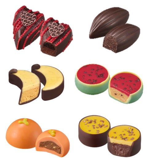 フルーツの魅力をたっぷり楽しむ、2024年バレンタイン限定コレクション。甘酸っぱいストロベリーとレモングラスの爽やかさ、ダークチョコレートのほろ苦さが調和した「ストロベリー」、見た目がキュートな「スイカ」「オレンジ」の形をした限定チョコレート6種類をラインナップしました。 (1月10日より期間限定販売) ※スイカ香料使用