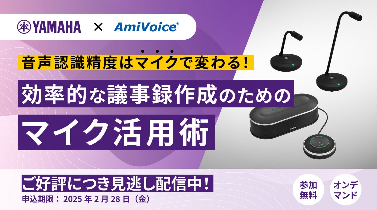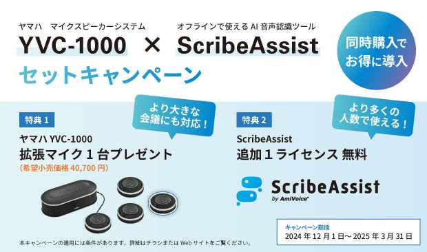 2024年12月25日(水)、株式会社アドバンスト・メディア(本社:東京都豊島区、代表取締役会長兼社長:鈴木清幸 以下、アドバンスト・メディア)は、AI音声認識AmiVoiceを活用した、オフラインで使える議事録作成ツール「ScribeAssist」とヤマハのマイクスピーカーシステム「YVC-1000」をセットで導入することで、初年度に最大150,000円以上お得になるキャンペーンを開催いたします。この機会に、ぜひAI音声認識と高性能マイクによる業務効率化をご検討ください。