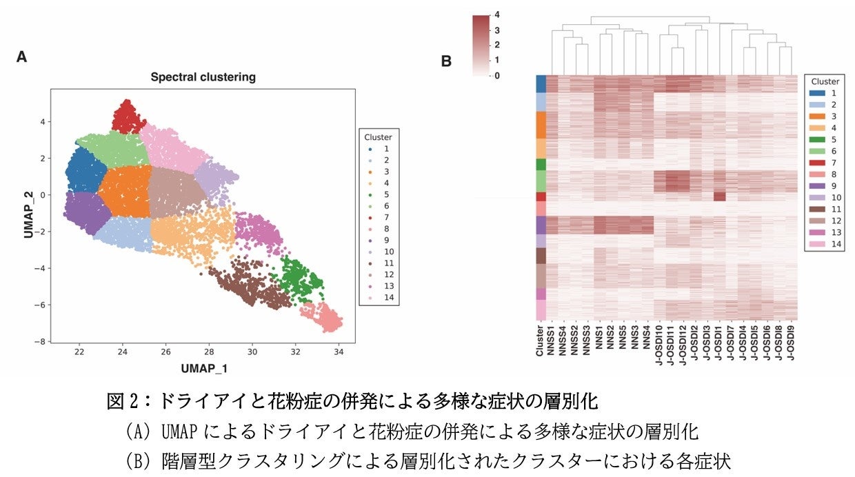 本研究から、9,041人の花粉症患者のうち、約半数である4,429人(49.99%)にドライアイ症状を認めました。ドライアイ症状の重症化は花粉症症状の重症化と関連を示しました。また、花粉症患者にドライアイを併発するリスク因子として、女性、低BMI、治療中の高血圧、血液疾患・膠原病・心疾患・肝疾患・呼吸器疾患の既往、アトピー性皮膚炎、トマトアレルギー、現在および過去の精神疾患、ペットの飼育、花粉症の季節におけるコンタクトレンズ装用中断歴、現在のコンタクトレンズの装用、喫煙習慣、6時間未満の睡眠時間などが特定されました。次元削減アルゴリズムUMAPから、ドライアイと花粉症の多様な症状は14群のクラスターに層別化されました(図2A)。階層型クラスタリングから、クラスター9が重症ドライアイと重症花粉症の併発群であり、クラスター1が軽症ドライアイと重症花粉症の併発群であることが特定されました (図2B)。
