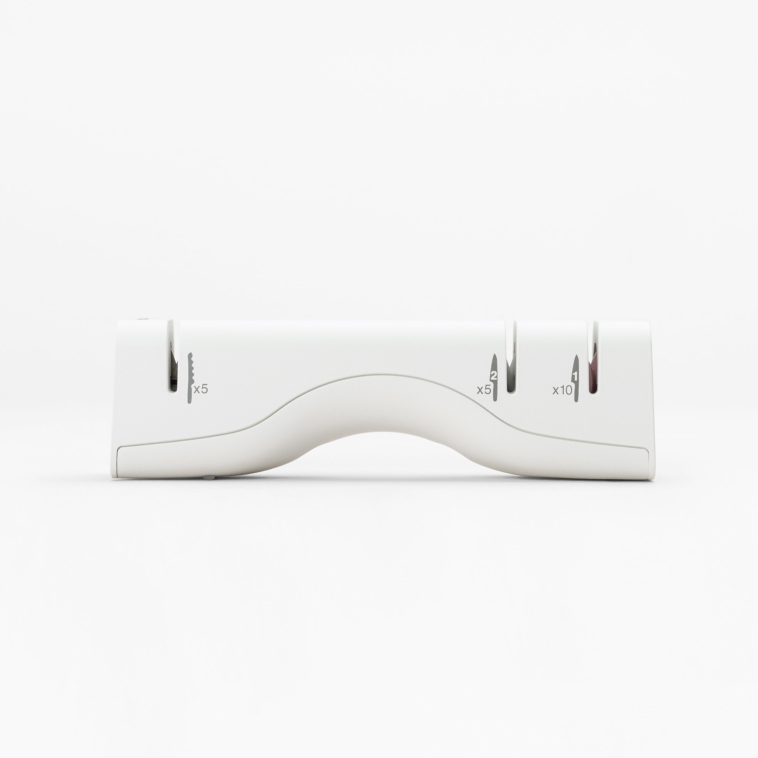 今回登場する「SELECT100 シャープナー」は日々の調理において食材を切る場面で、少しでも切れ味が悪いと感じたときにさっと研いで切れ味を戻すことで快適な調理を実現する商品です。コンパクトな見た目に対して1台でパン切り用と両刃用の包丁を研ぐことができます。中央が凹んだ形状で握りやすい世界初※1の独自設計で、特許を取得しています。壁掛けフックを搭載することで、調理中すぐに手に取れる場所への収納も可能です。中央が凹んだ形状はしっかり握りこむことで土台を固定させるため包丁を研ぎやすく、左右対称の形状は左右どちらの利き手の方にも使いやすい仕様となっています。さらに、目安の研ぎ回数が記載されているので研ぎ足りなかったり、研ぎ過ぎたりする心配がなく、お気に入りの包丁の切れ味を保つことと、長持ちさせることを両立します。